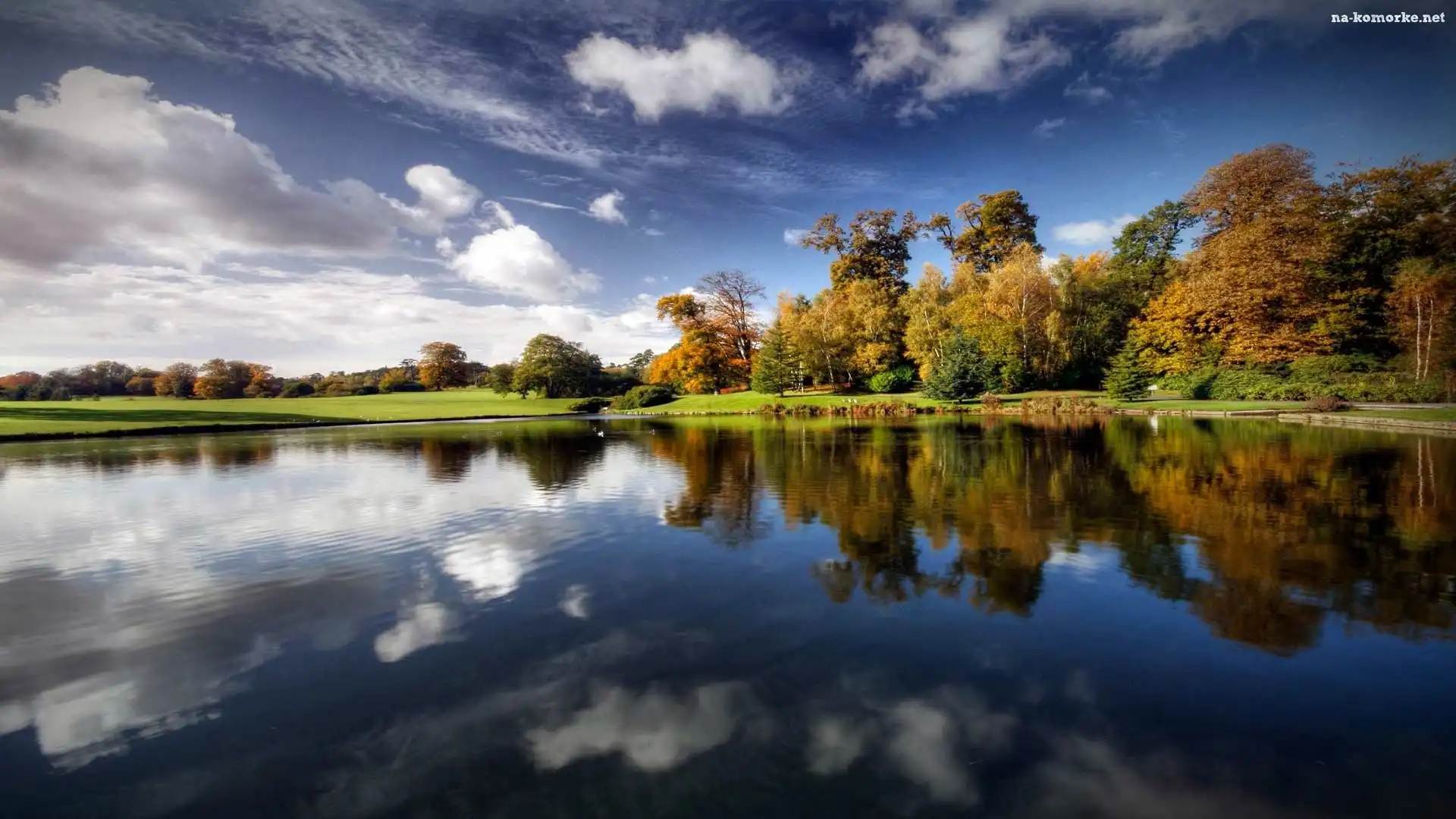 Odbicie, Jezioro, Las, Łąka, Obłoki na Komórkę