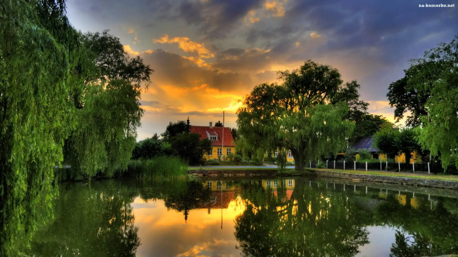 Odbicie, Wierzby, Płaczące, Domy, Chmury na Komórkę