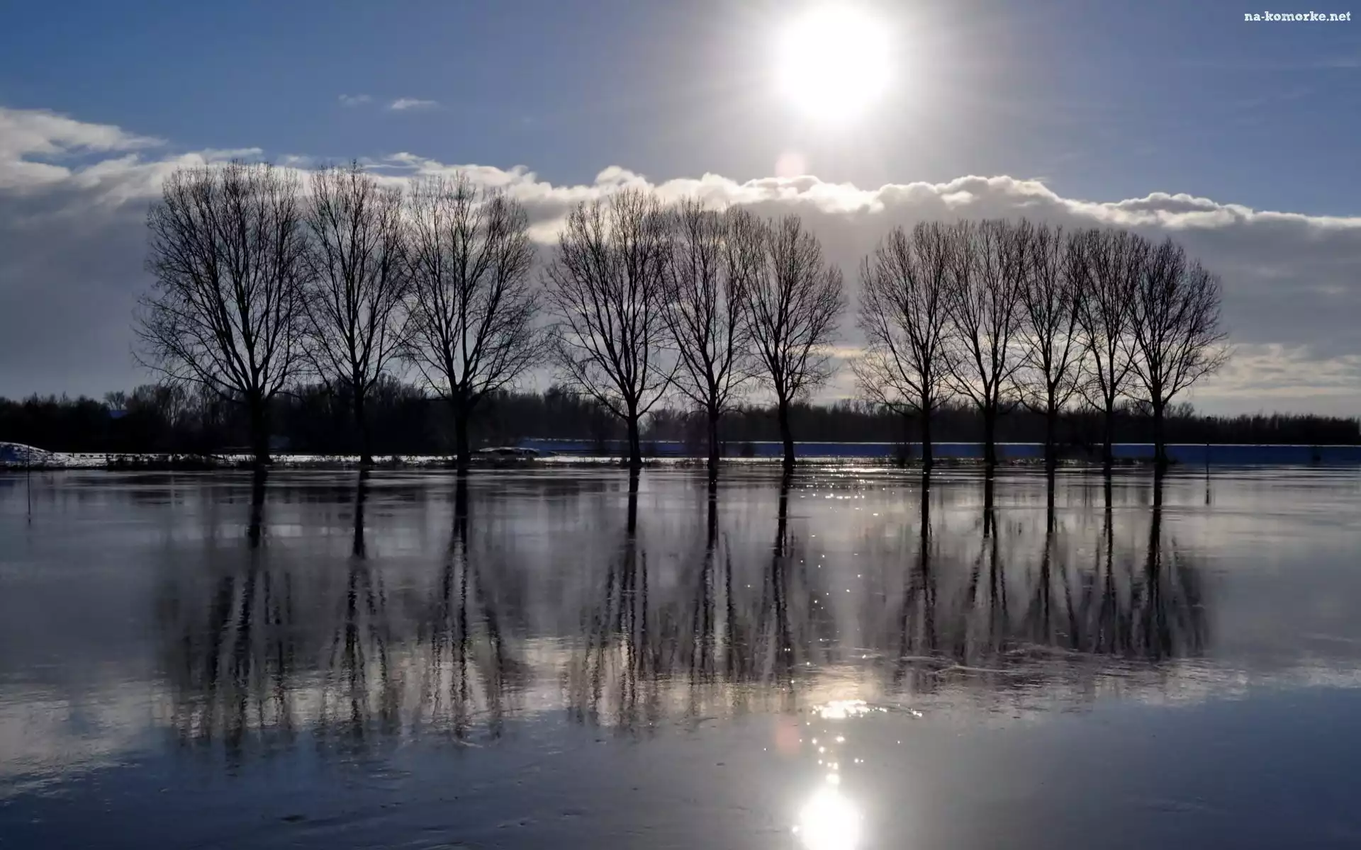 Odbicie, Zamarznięte, Jezioro, Drzewa, Słońce na Komórkę