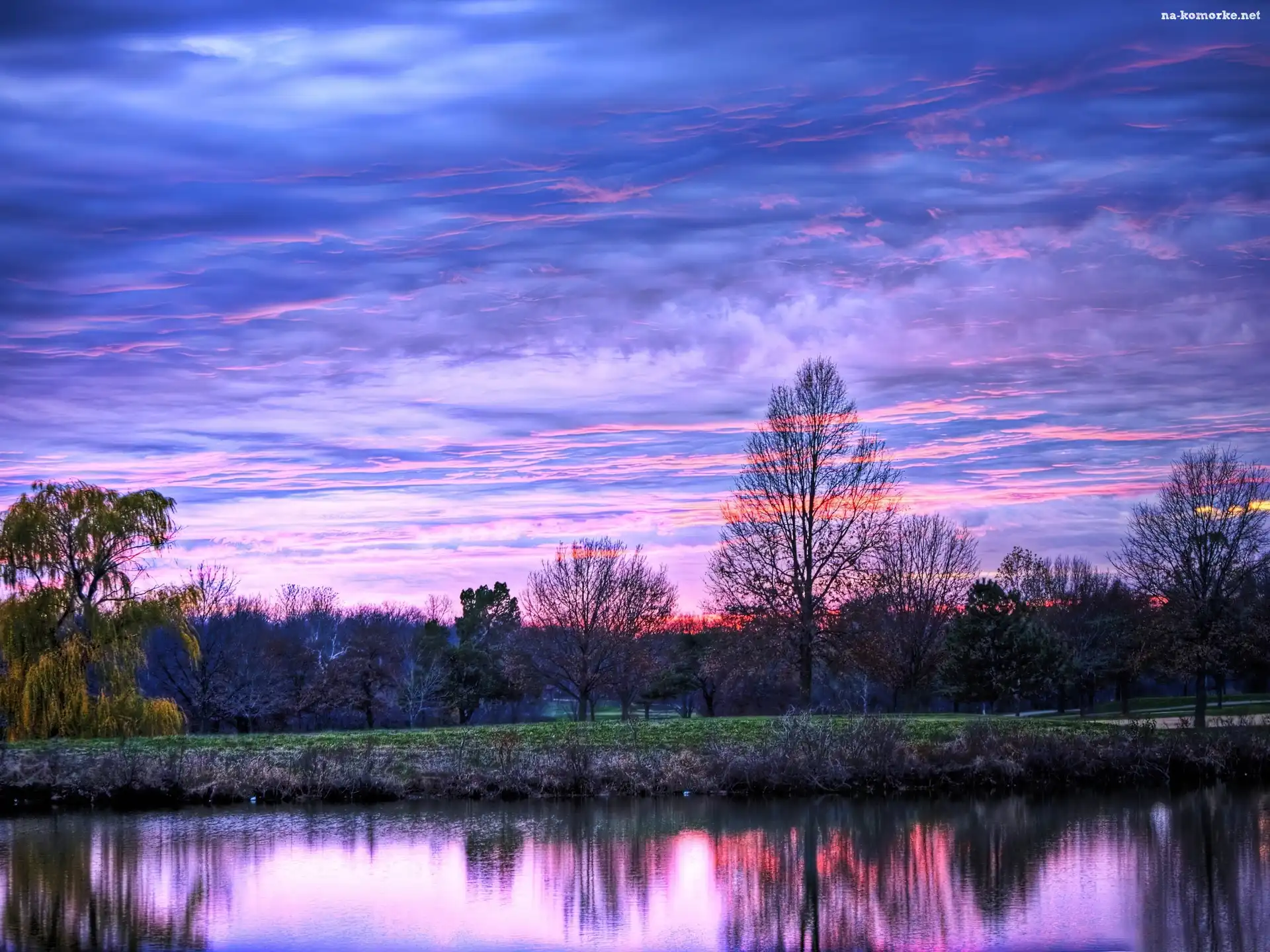 Odbicie, Świt, Rzeka, Drzewa, Chmury na Komórkę