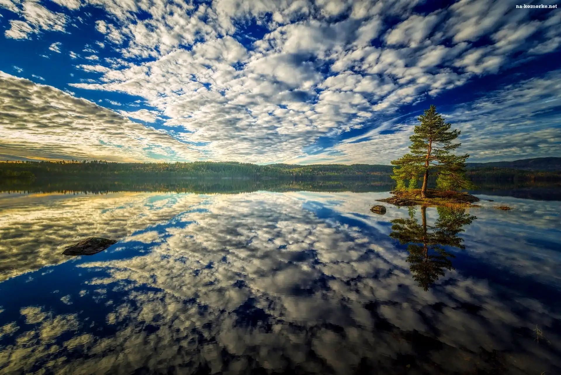 Odbicie, Jezioro, Horyzont, Drzewo, Chmury na Komórkę