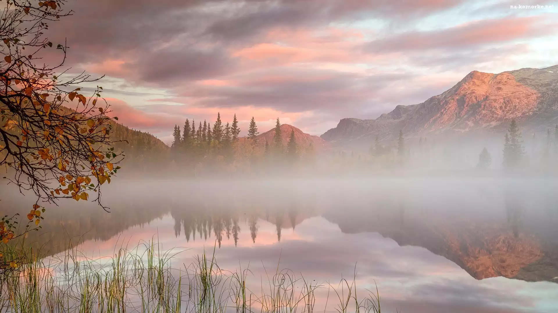Mgła, Chmury, Góry, Odbicie, Las, Drzewa, Jezioro na Komórkę