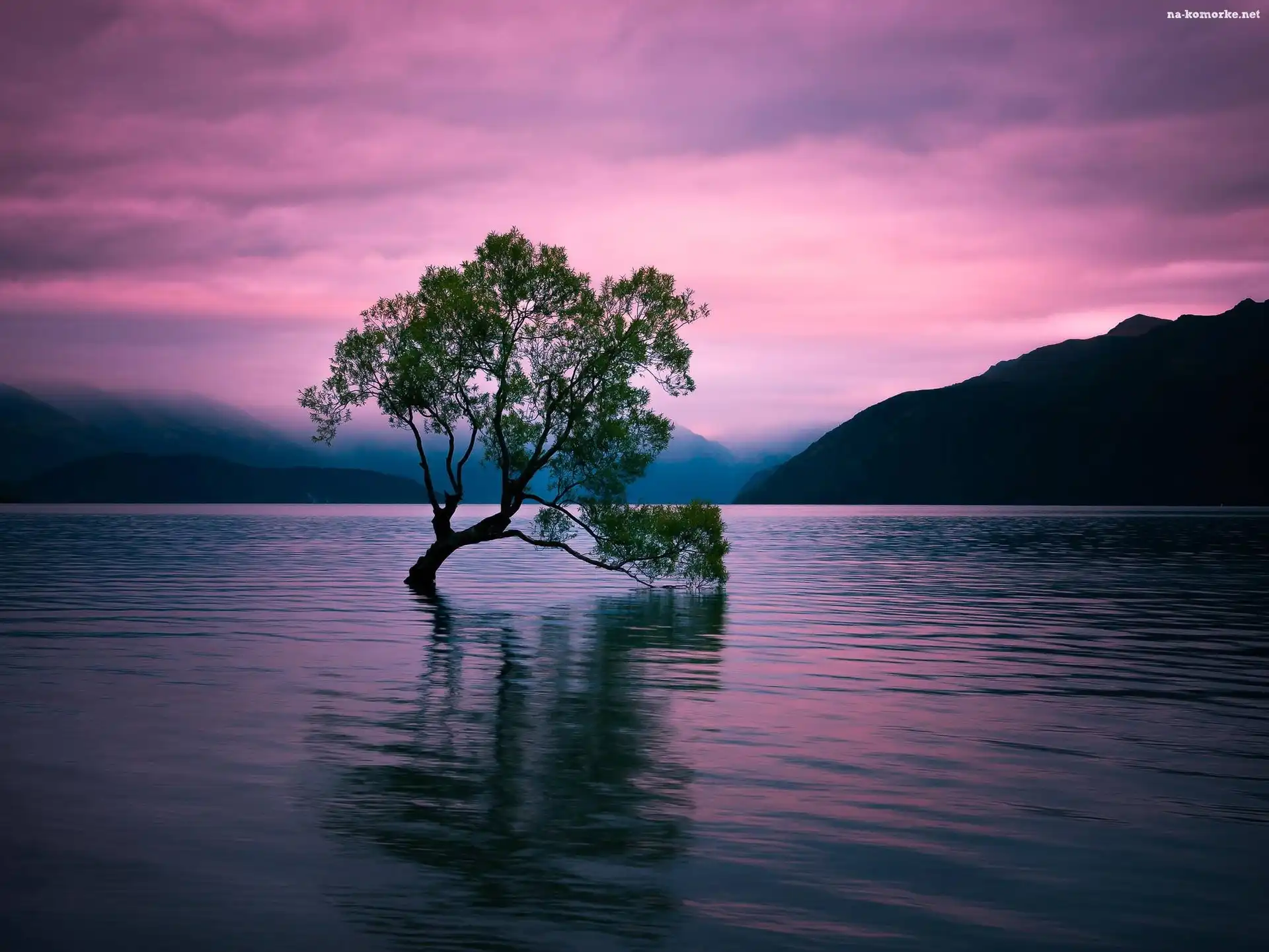 Odbicie, Drzewo, Jezioro, Góry, Niebo na Komórkę