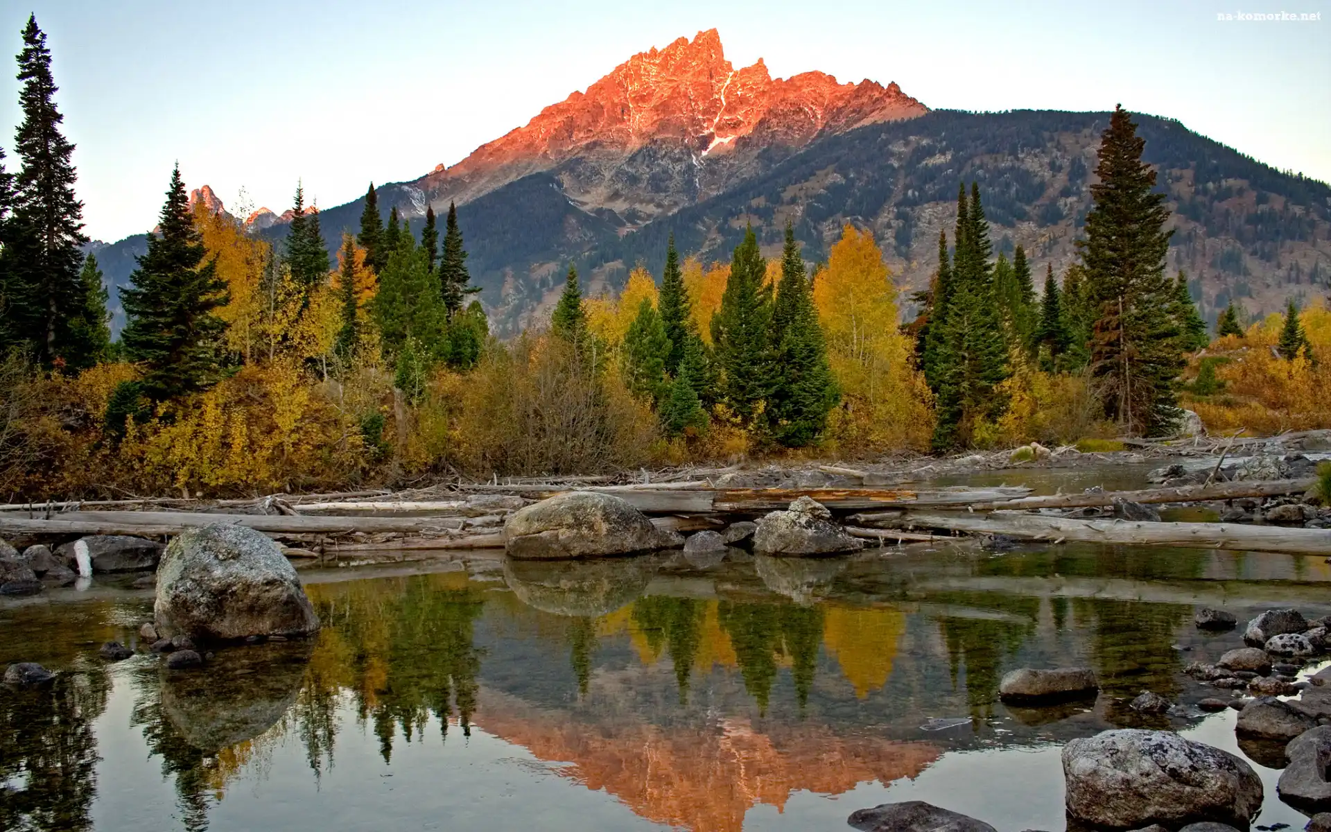 Drzewa, Odbicie, Kamienie, Góry, Niebo, Zachód słońca, Jezioro na Komórkę