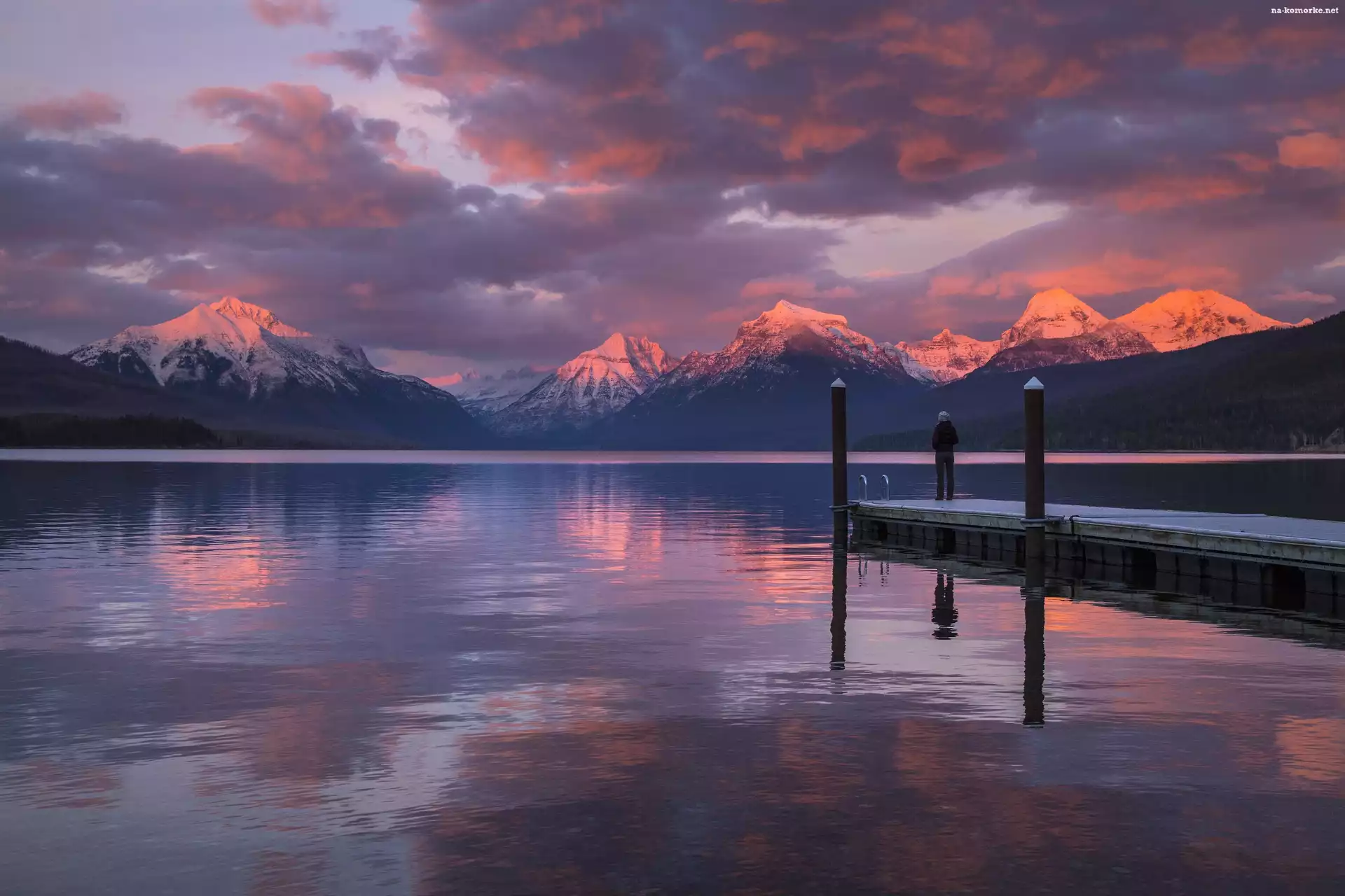 Jezioro, Odbicie, Góry, USA, Pomost, Zachód, Słońca na Komórkę