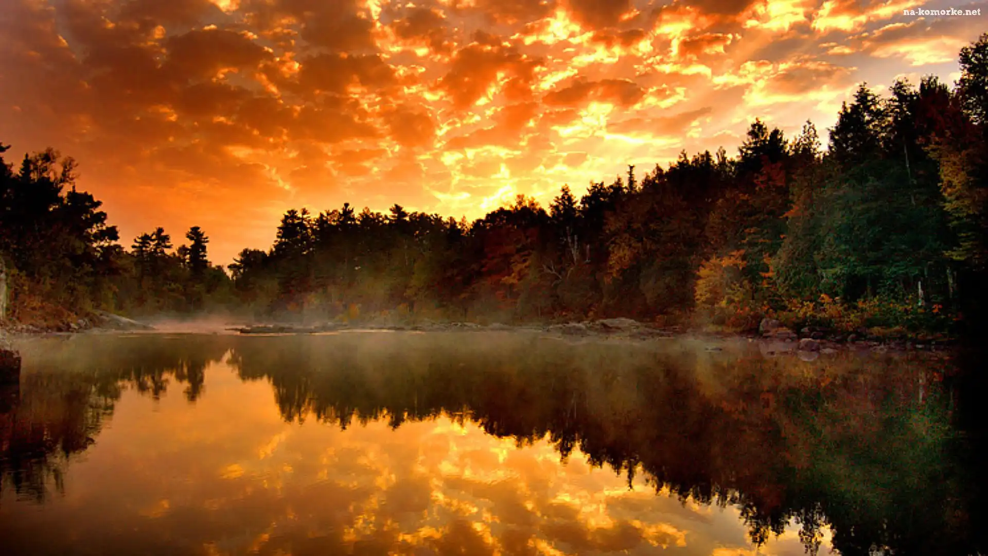 Odbicie, Zachód, Słońca, Jezioro, Las na Komórkę