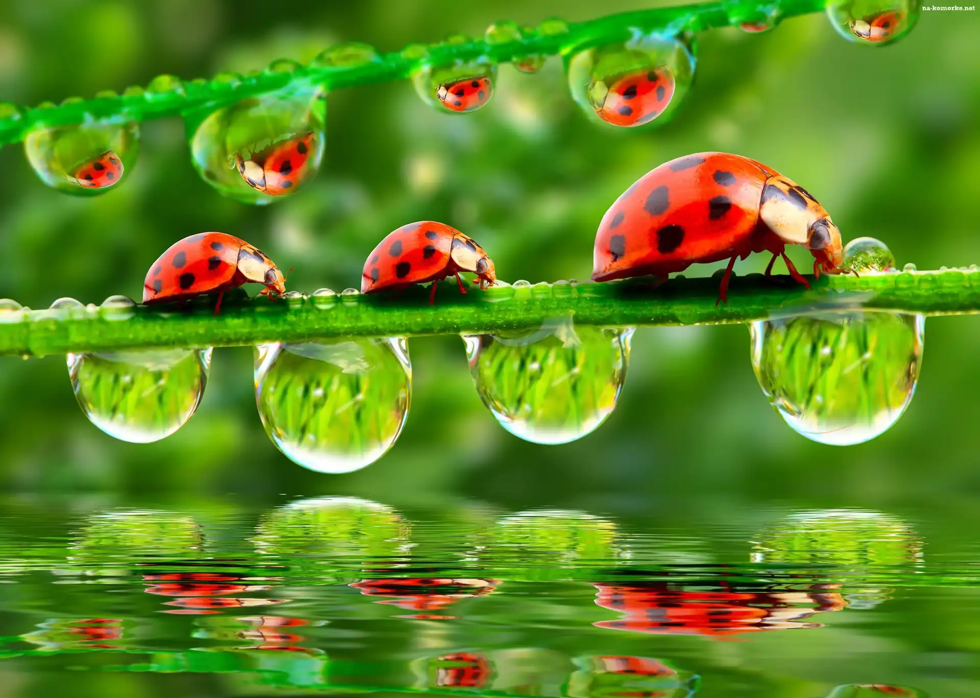 Odbicie, Biedronki, Trawa, Krople, Wody na Komórkę