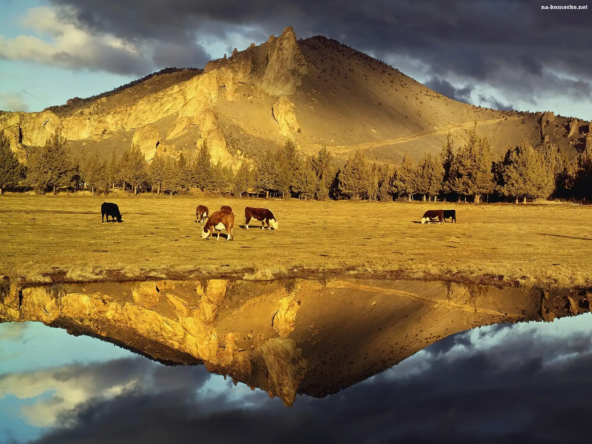 Odbicie, Góra, Pastwisko, Krowy, Woda na Komórkę