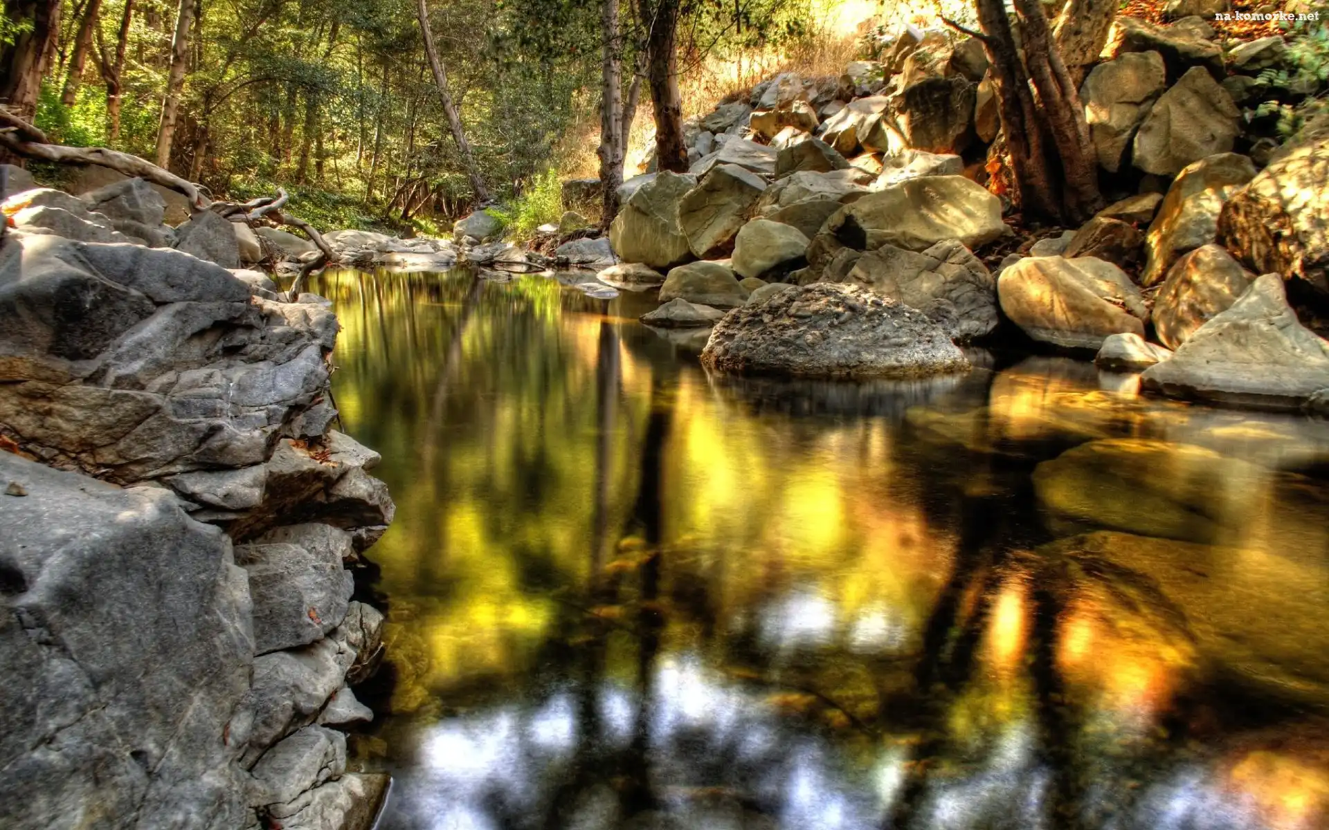 Odbicie, Rzeka, Kamienie, Las, Lustrzane na Komórkę
