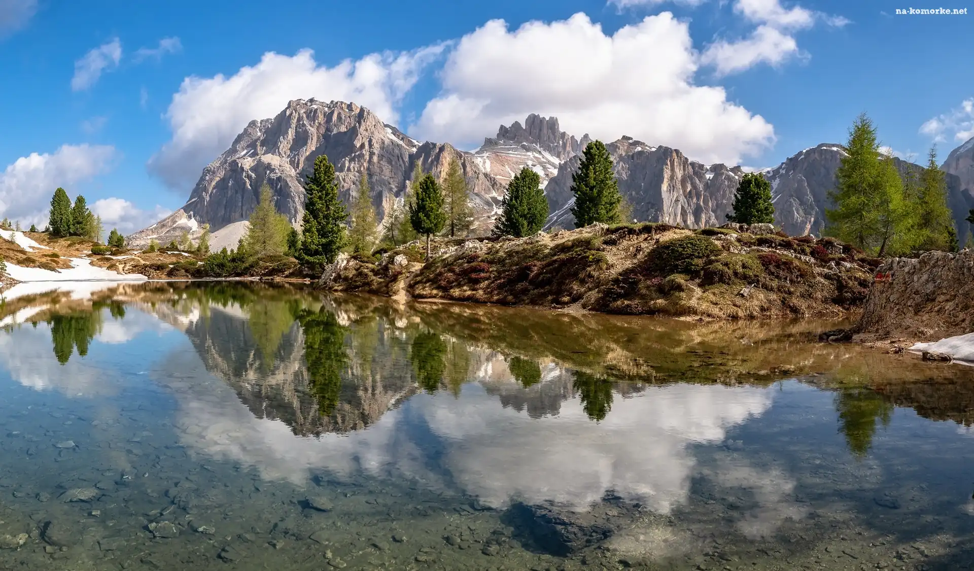 Jezioro, Góry, Chmury, Lago Limides, Włochy, Dolomity, Tyrol, Drzewa, Odbicie na Komórkę