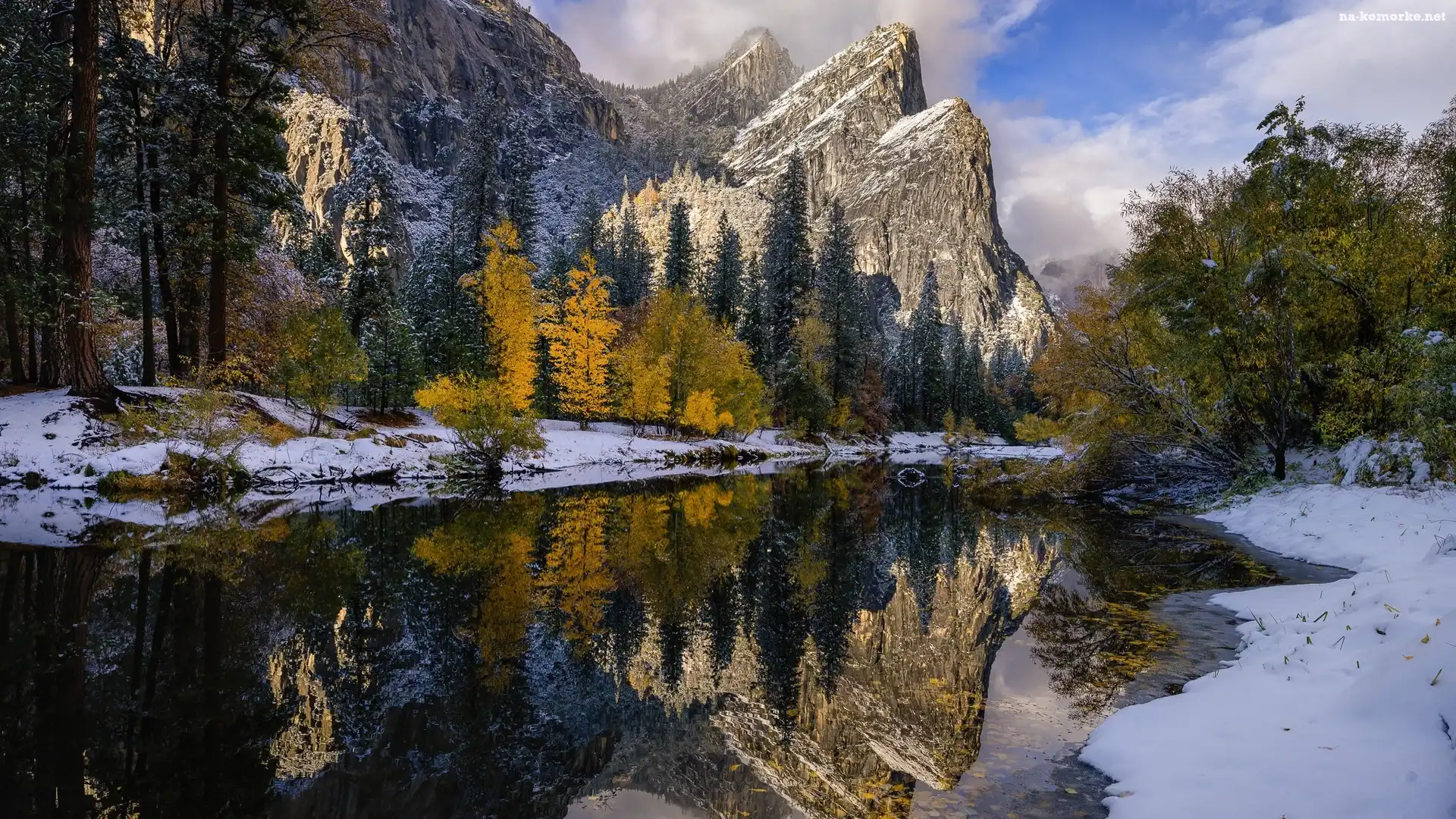 Odbicie, Góry, Rzeka, Śnieg, Drzewa na Komórkę