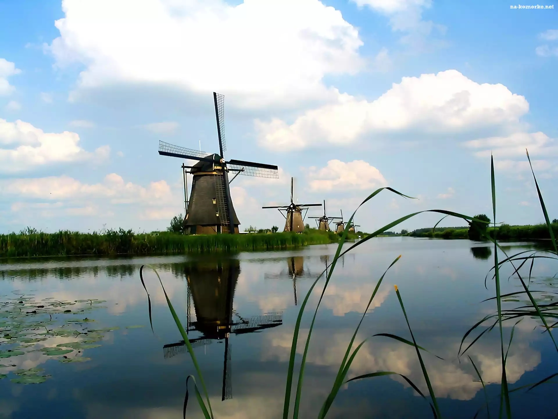 Odbicie, Wiatraki, Nad Rzeką, Obłoki, Rośliny na Komórkę