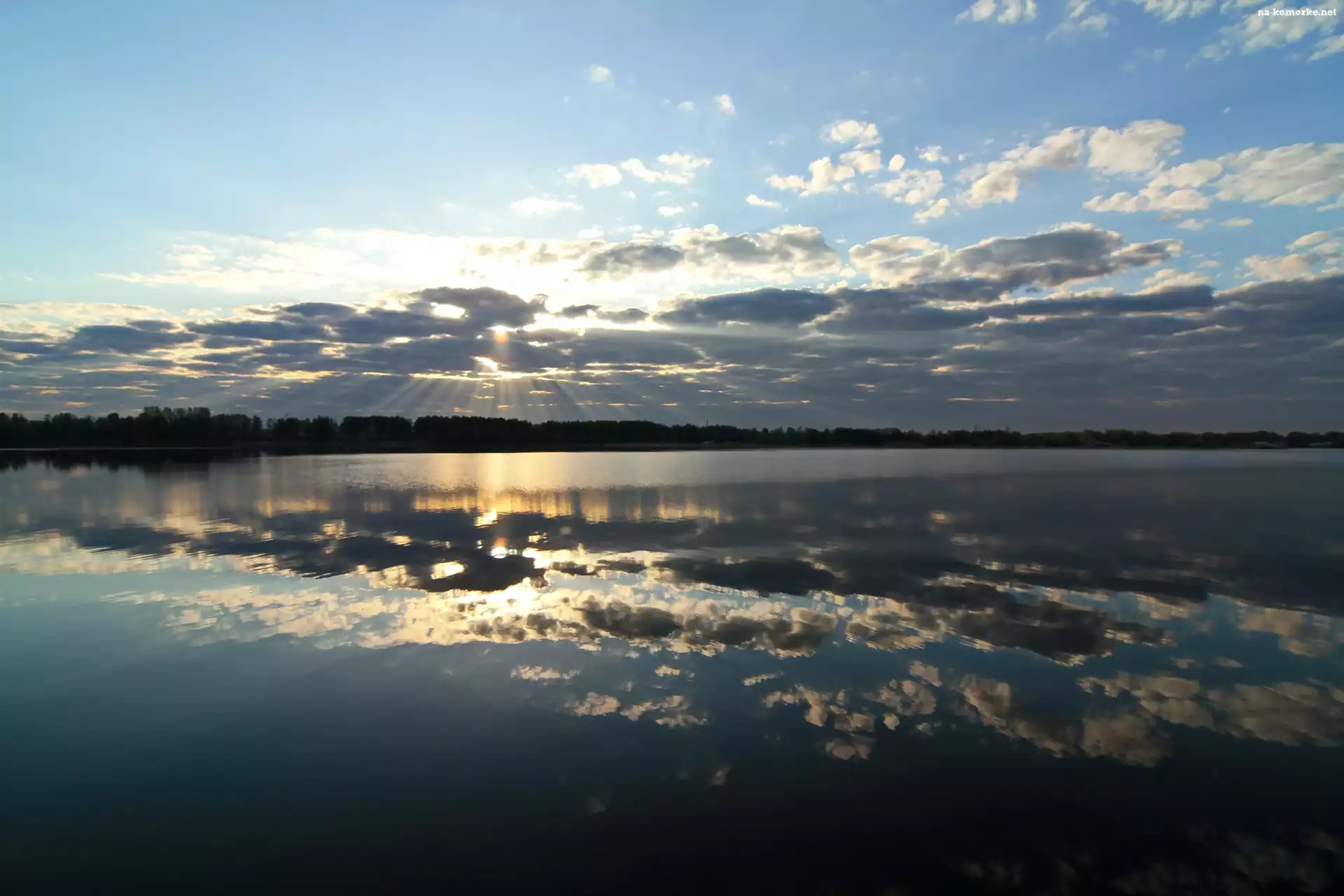 Odbicie, Jezioro, Chmury, Przebijające, Światło na Komórkę