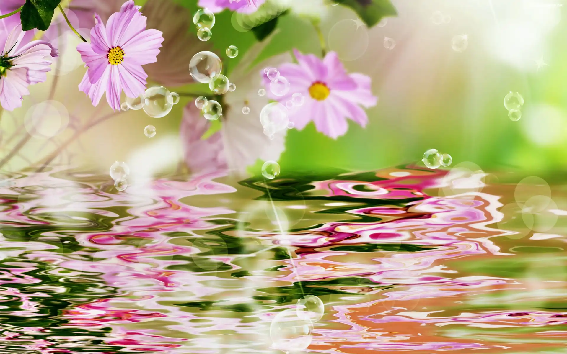 Odbicie, Kwiaty, Kosmea, Rozmyta, Woda na Komórkę