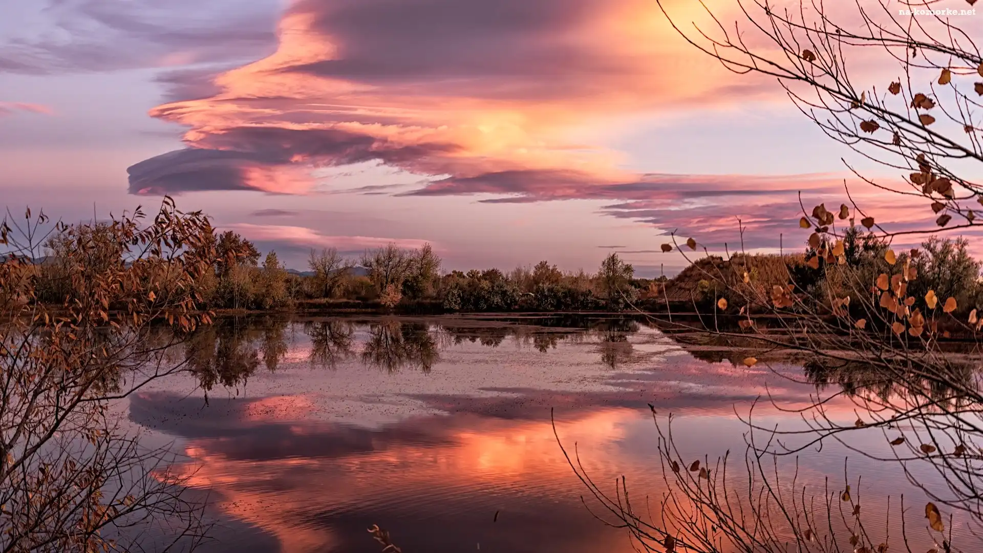 Odbicie, Jezioro, Drzewa, Zachód słońca, Chmury na Komórkę