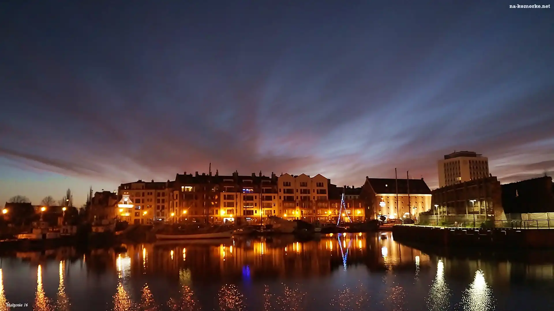 Miasto, Światła, Woda, Budynki, Gdańsk, Wschód Słońca, Niebo, Odbicie na Komórkę