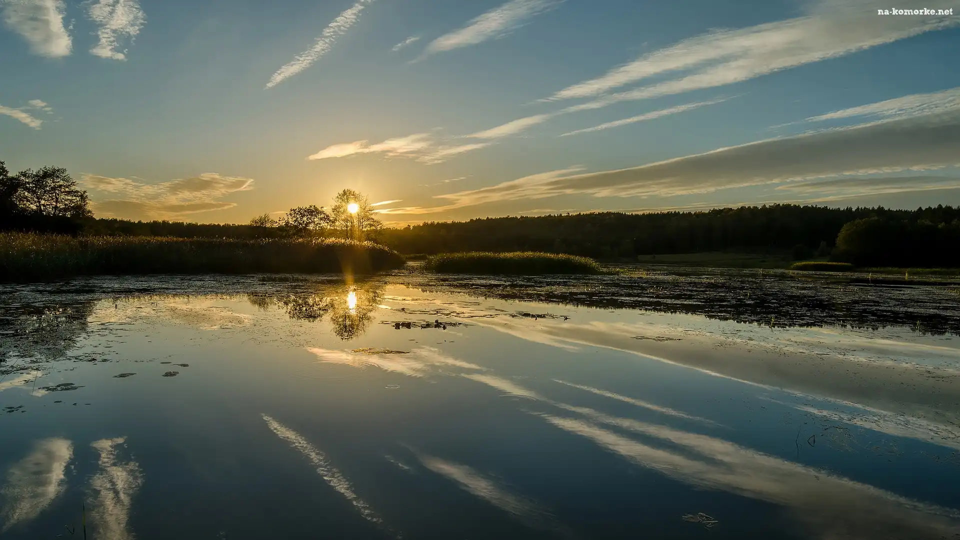 Odbicie, Jezioro, Brzeg, Roślinność, Wschód słońca na Komórkę