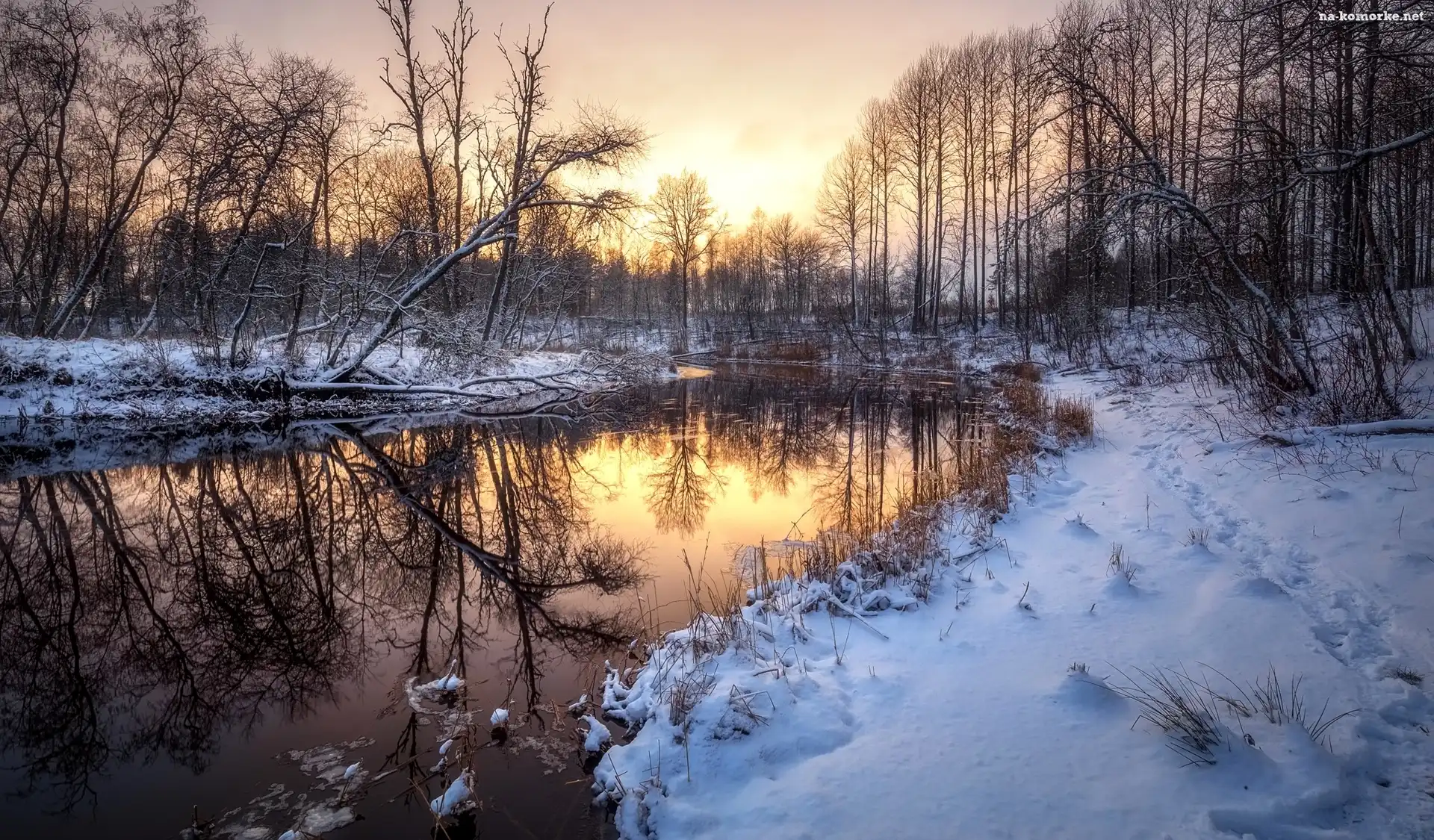 Odbicie, Rzeka, Świt, Zima, Drzewa na Komórkę