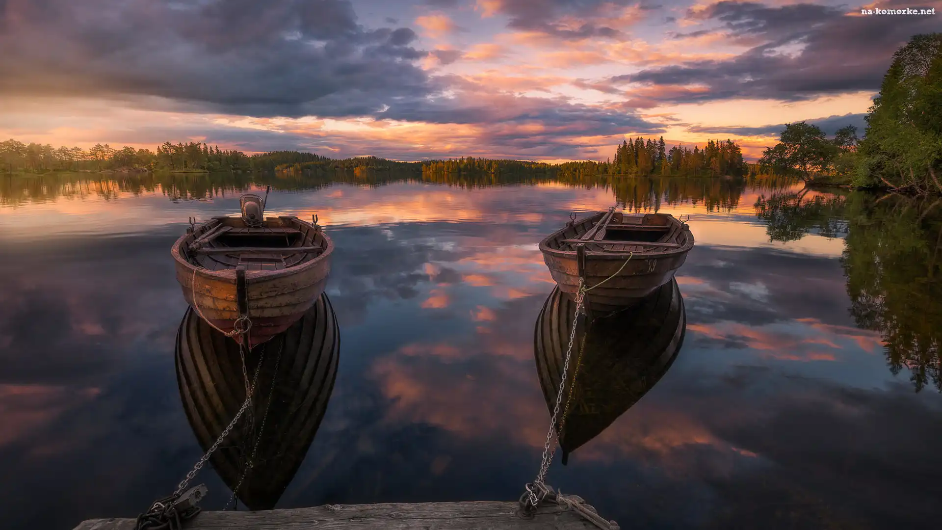 Norwegia, Łódki, Chmury, Ringerike, Jezioro, Drzewa, Pomost na Komórkę
