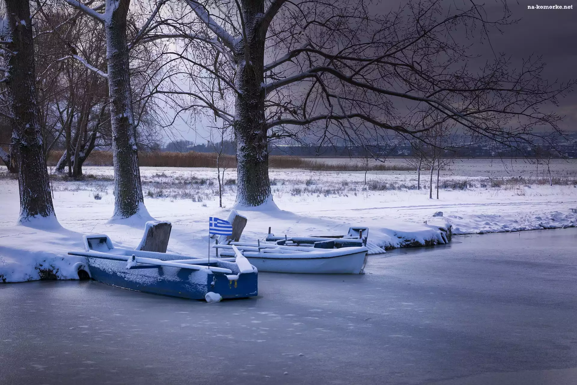 Śnieg, Zima, Jezioro, Łódki, Drzewa na Komórkę