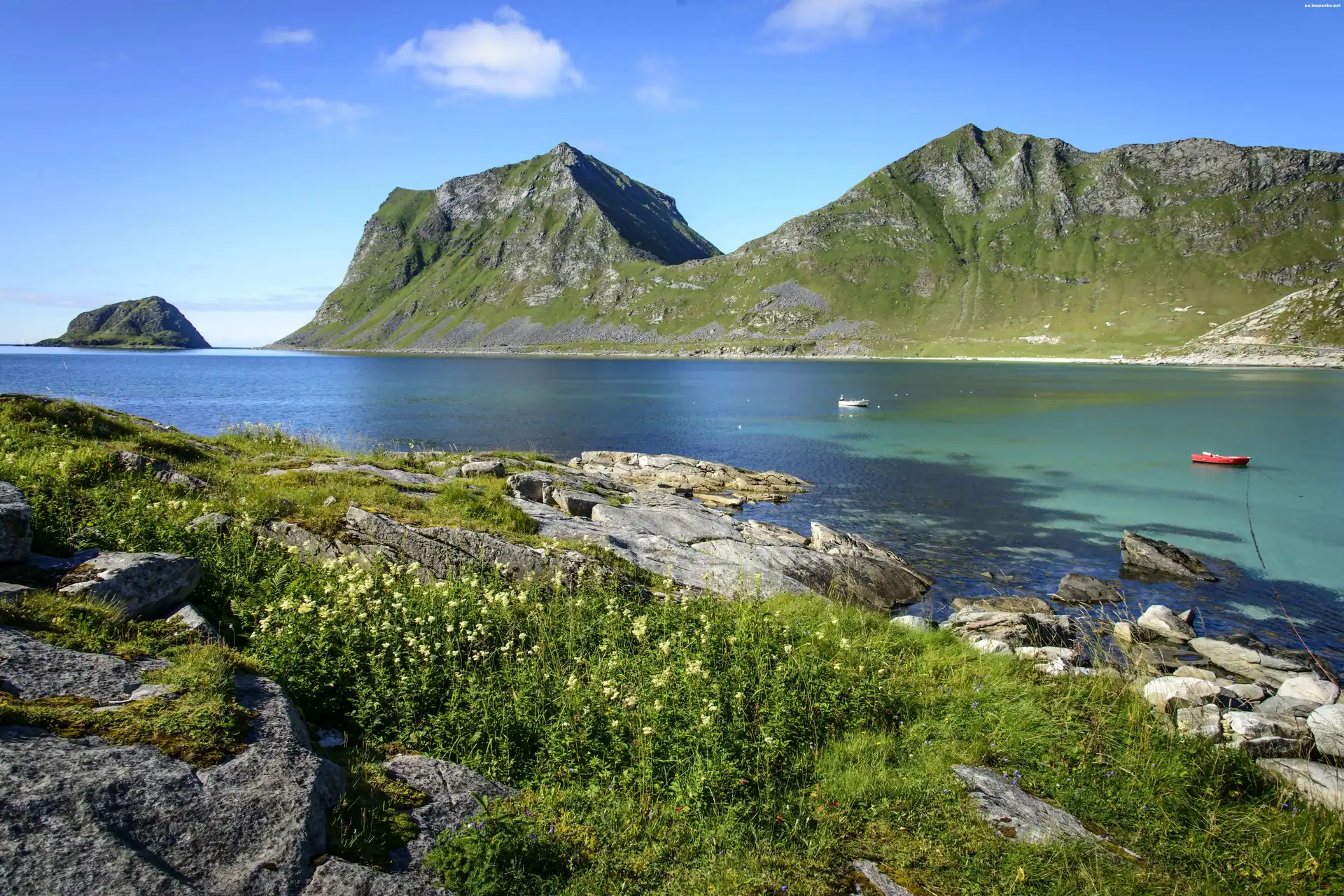 Łodzie, Jezioro, Góry, Roślinność, Kamienie, Norwegia na Komórkę
