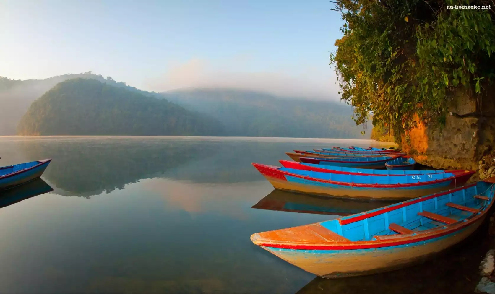 Łodzie, Phewa, Jezioro, Nepal, Pokhara, Poranek na Komórkę