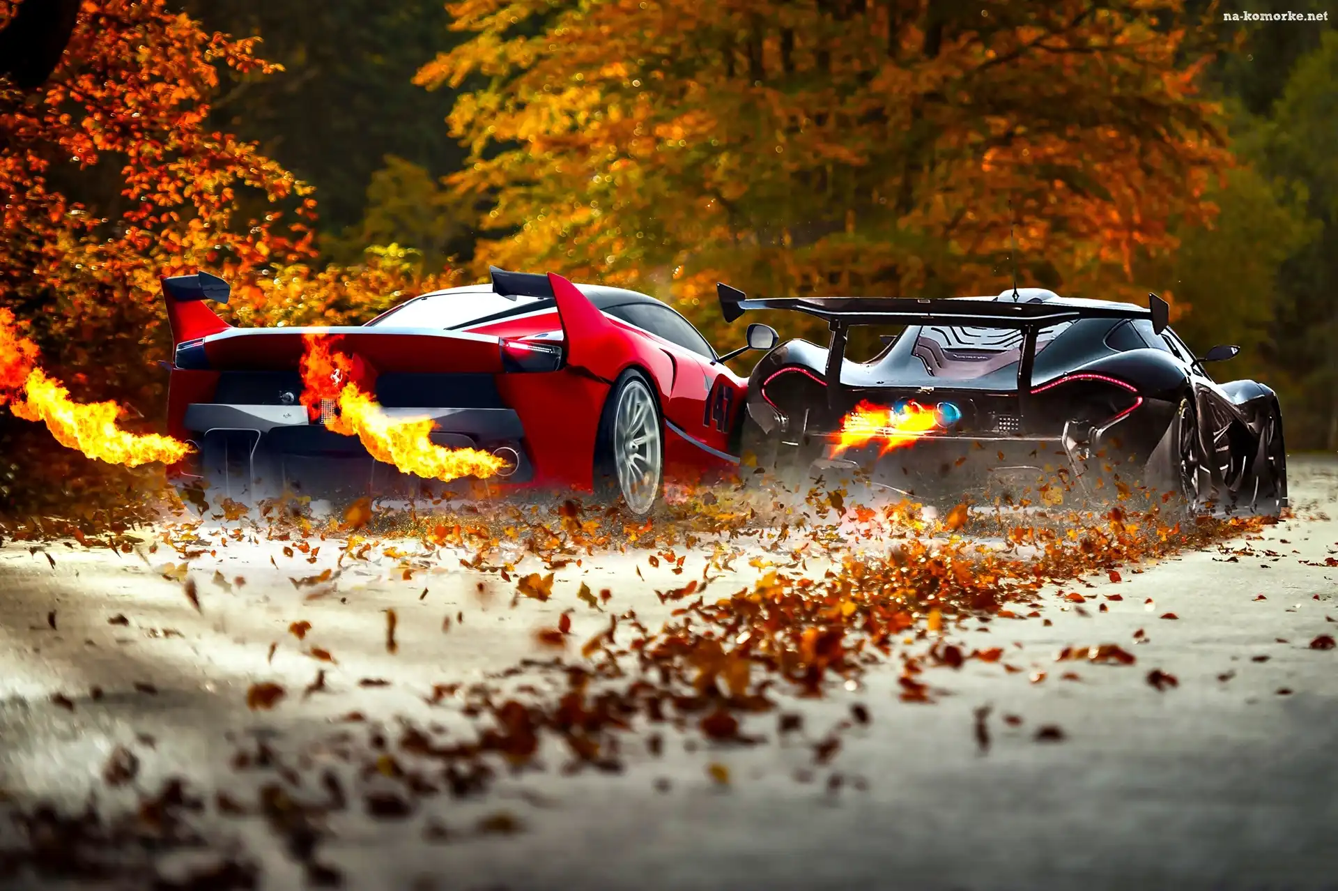 Ogień, Droga, Jesień, Drzewa, Samochody, Liście na Komórkę