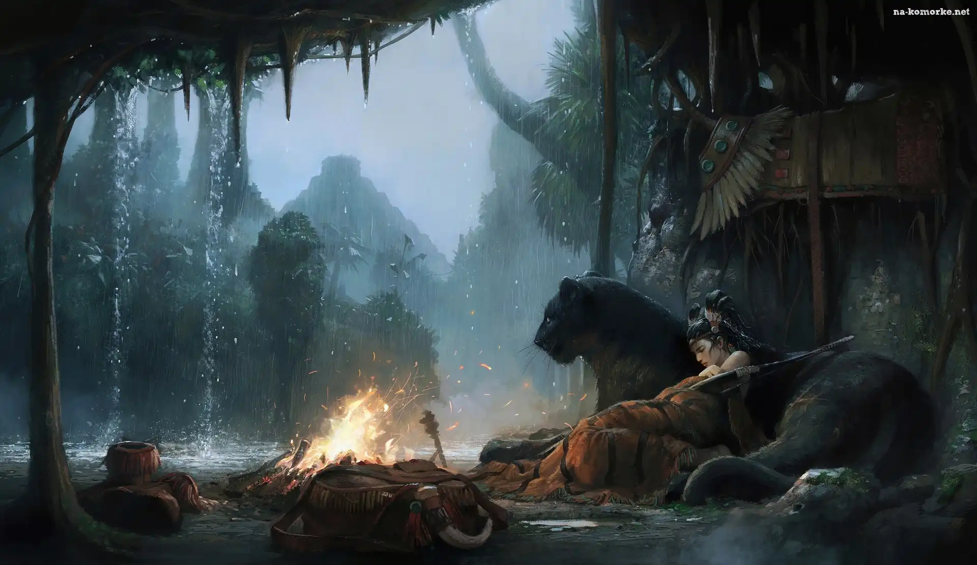 Ognisko, Fantasy, Czarna pantera, Wojowniczka, Deszcz na Komórkę