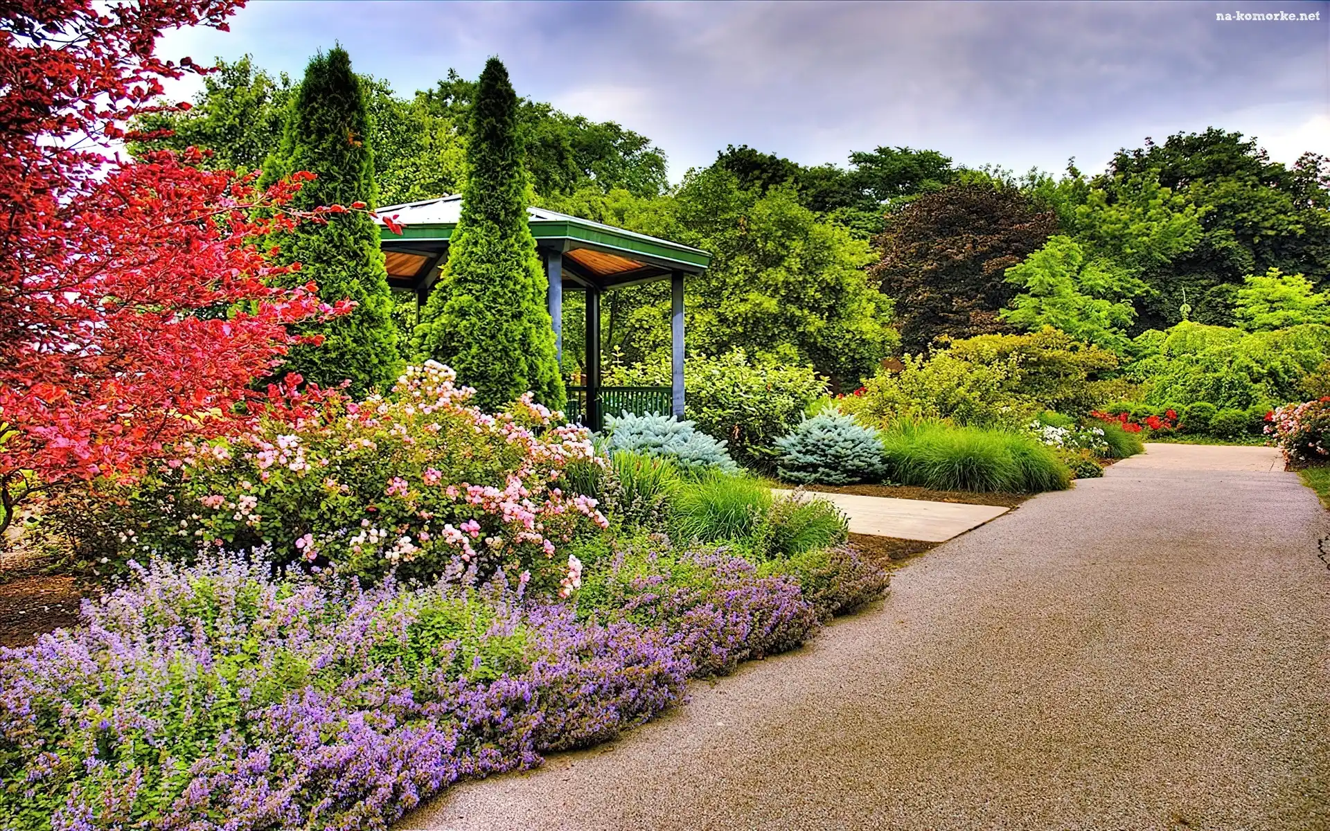Ogród, Kwiaty, Altanka, Drzewa na Komórkę
