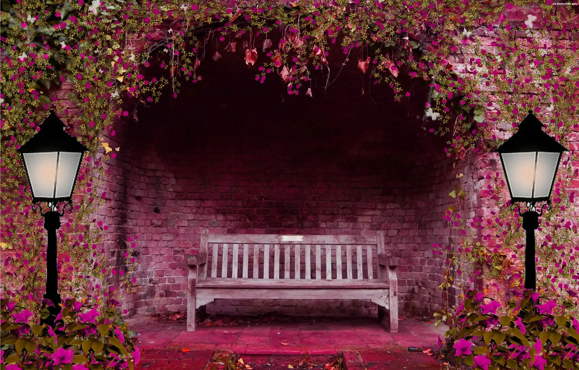 Ogród, Kwiaty, Ławka, Lampy na Komórkę
