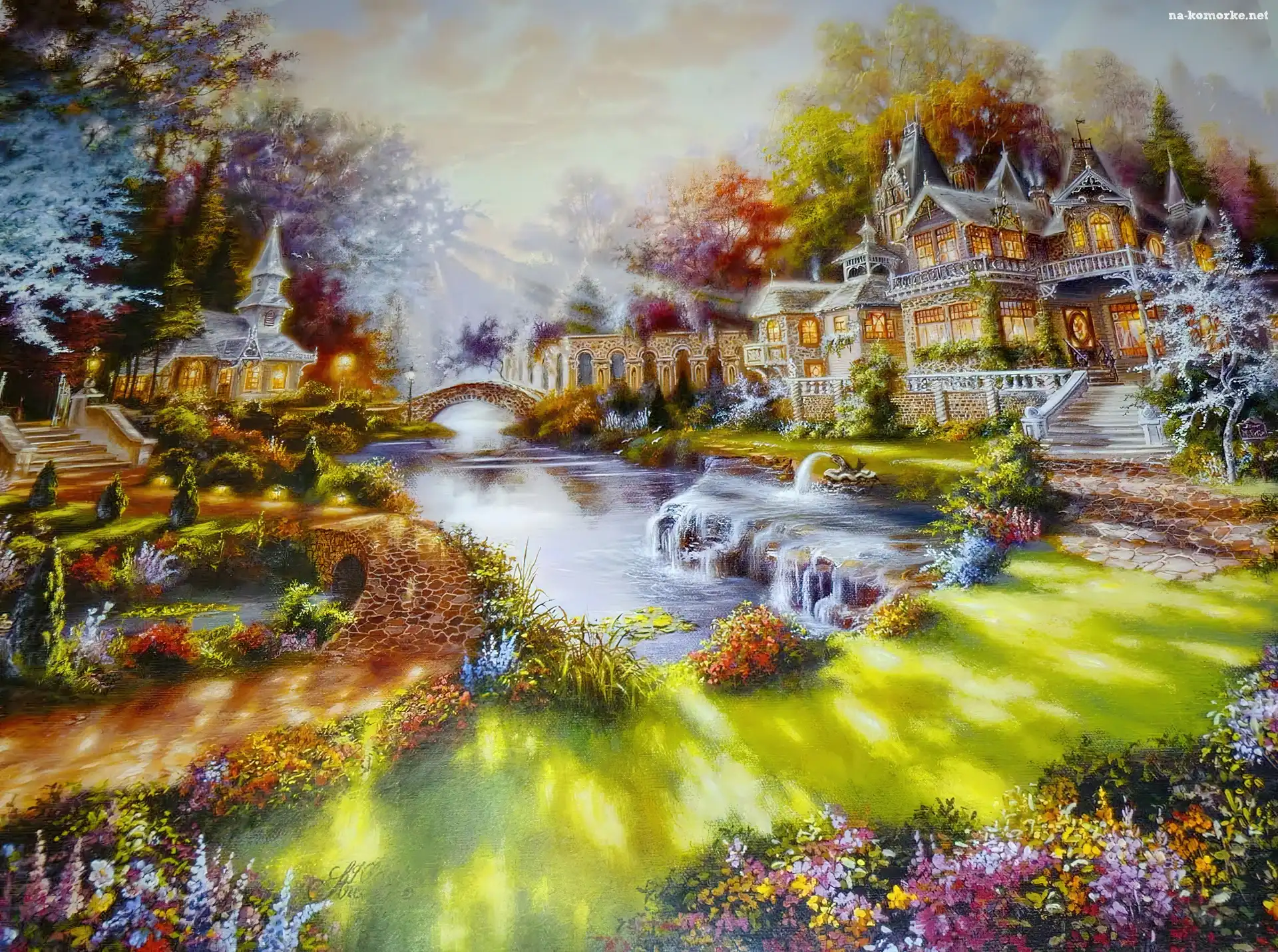 Ogród, Kwiaty, Domy, Mostek na Komórkę