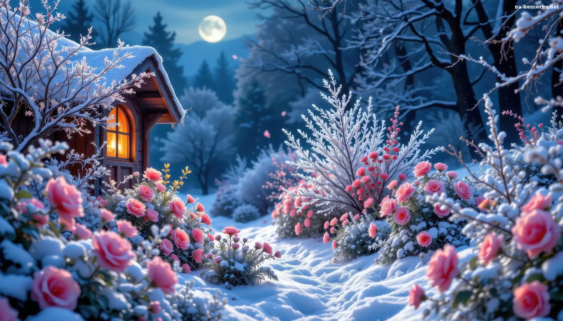 Ogród, Róże, Drzewa, Grafika AI, Kwiaty, Księżyc, Zima, Dom na Komórkę