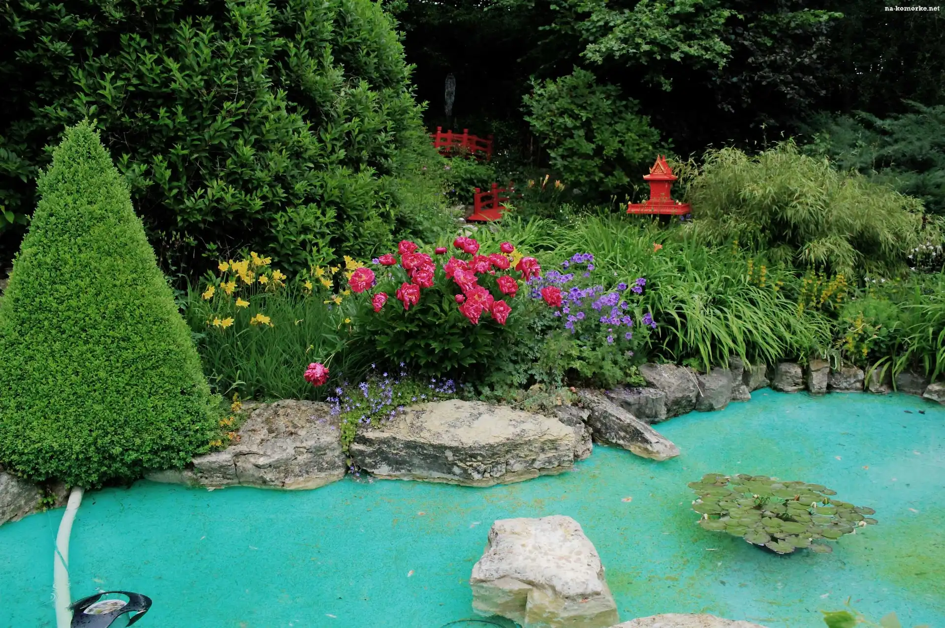 Ogród, Woda, Kwiaty, Krzewy na Komórkę
