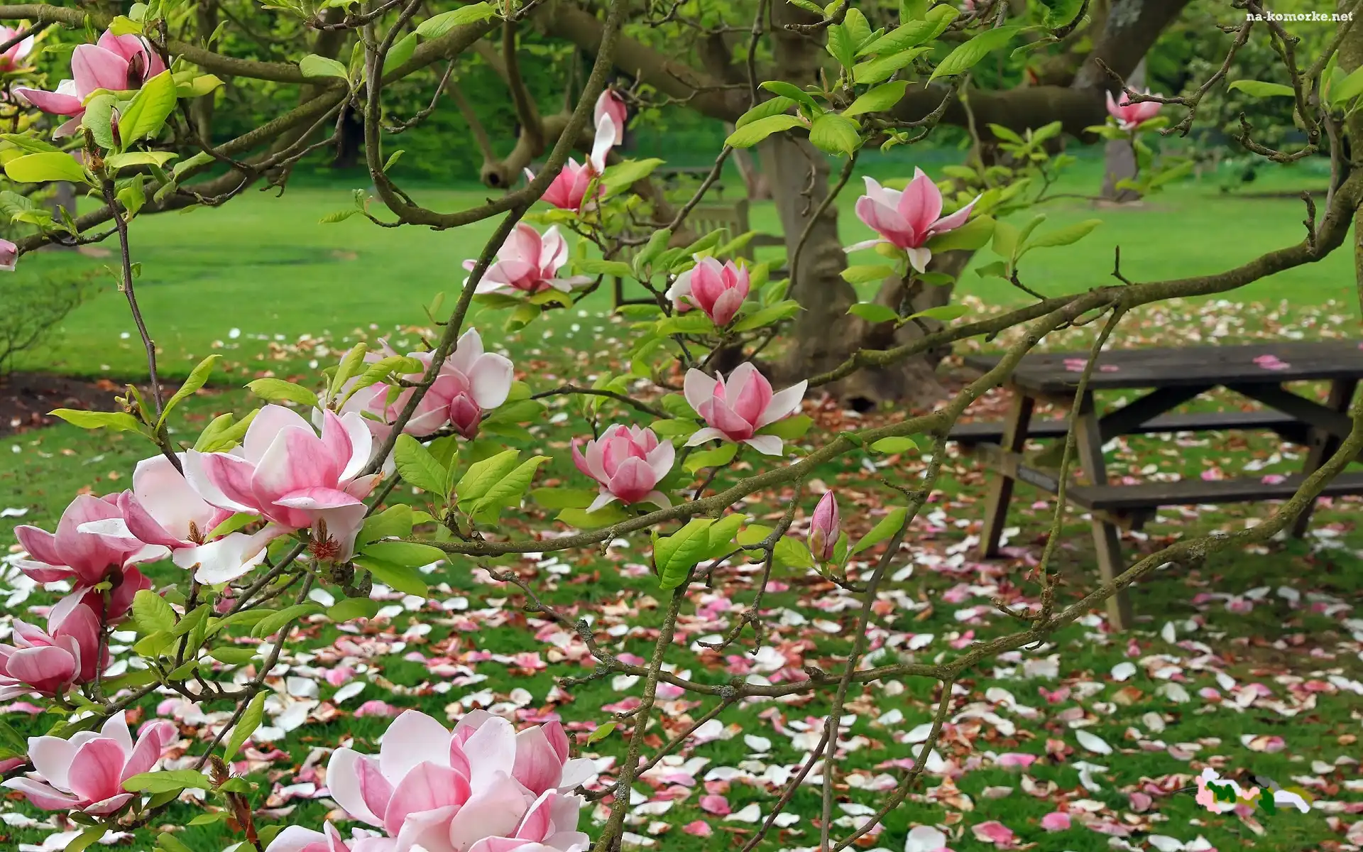 Ogród, Stolik, Różowa, Magnolia na Komórkę