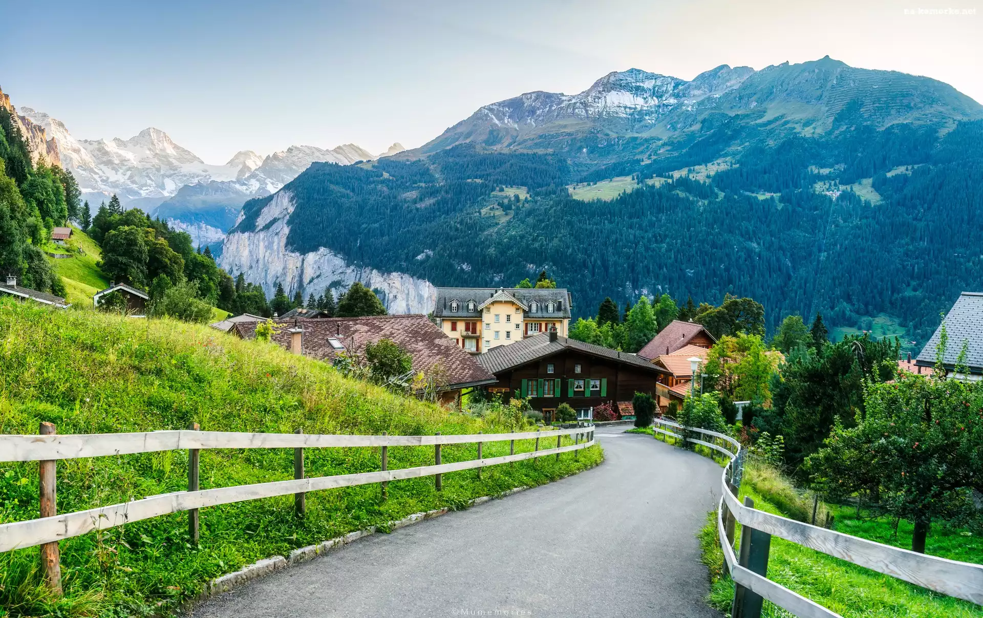 Wengen, Alpy Berneńskie, Lasy, Drzewa, Droga, Góry, Szwajcaria, Wieś, Ogrodzenie, Roślinność, Domy na Komórkę |