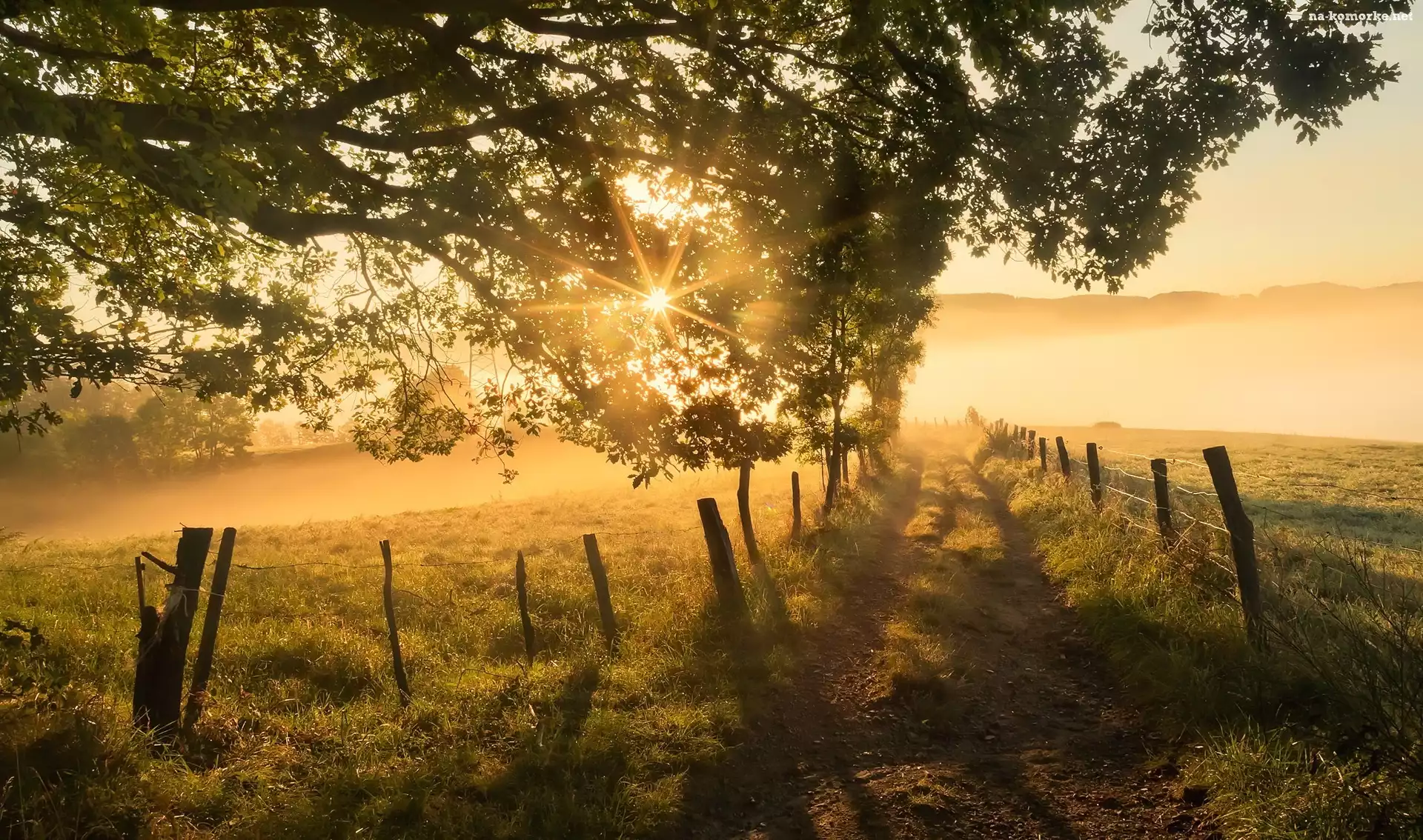 Ogrodzenie, Poranek, Gałęzie, Pole, Mgła, Przebijające światło, Drzewo, Droga na Komórkę