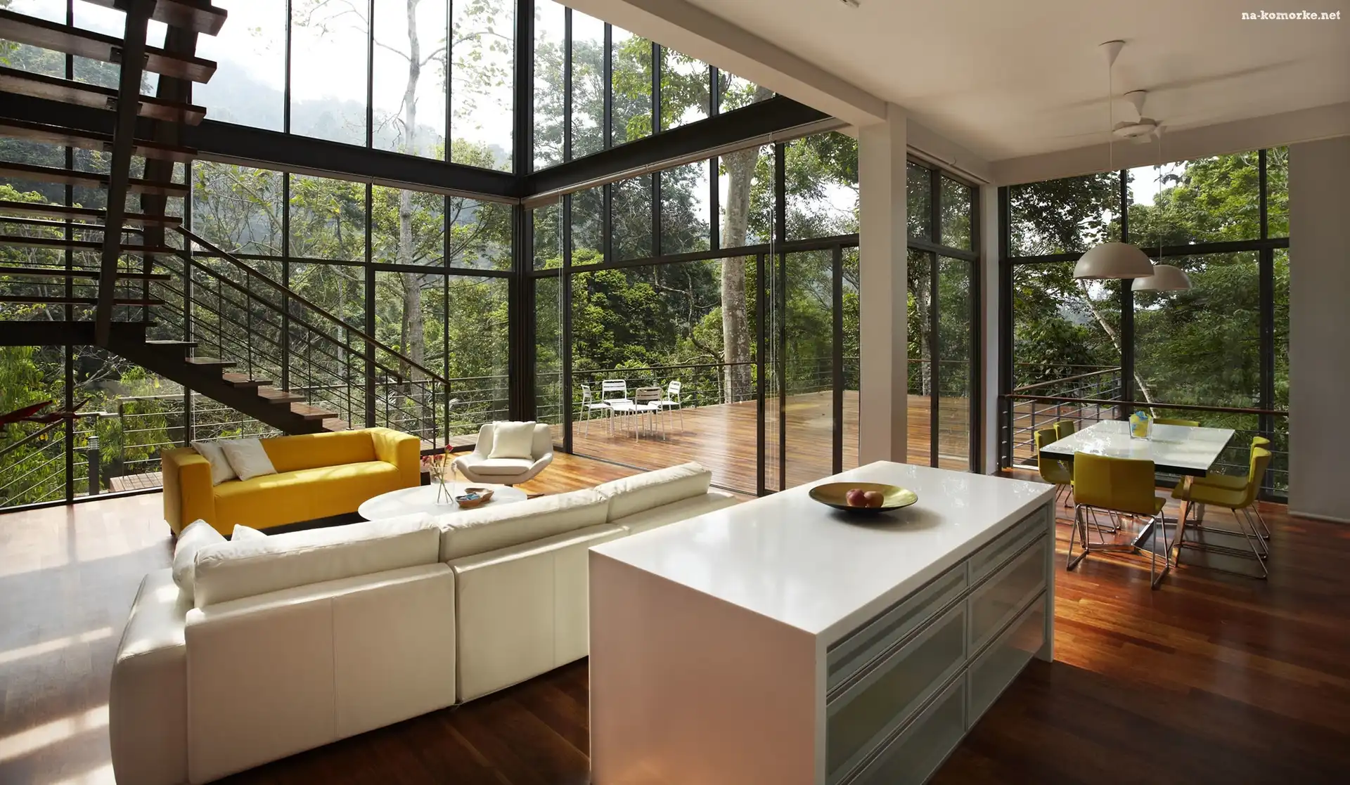 Dom, Okna, Drzewa, Wnętrze, Salon, Schody, Widokowe na Komórkę