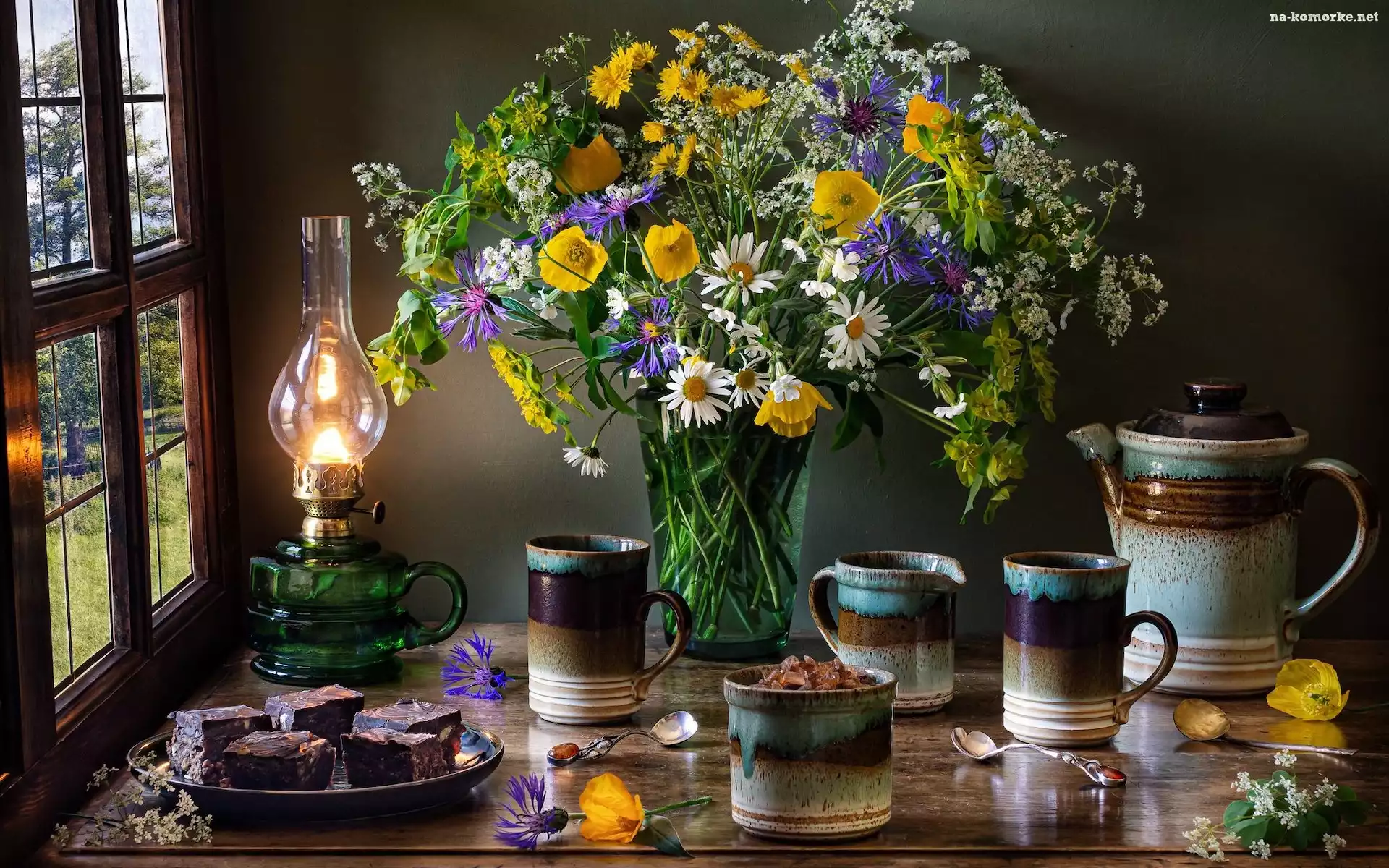 Kubki, Ciasto, Kompozycja, Dzbanek, Bukiet kwiatów, Lampa, Okno na Komórkę