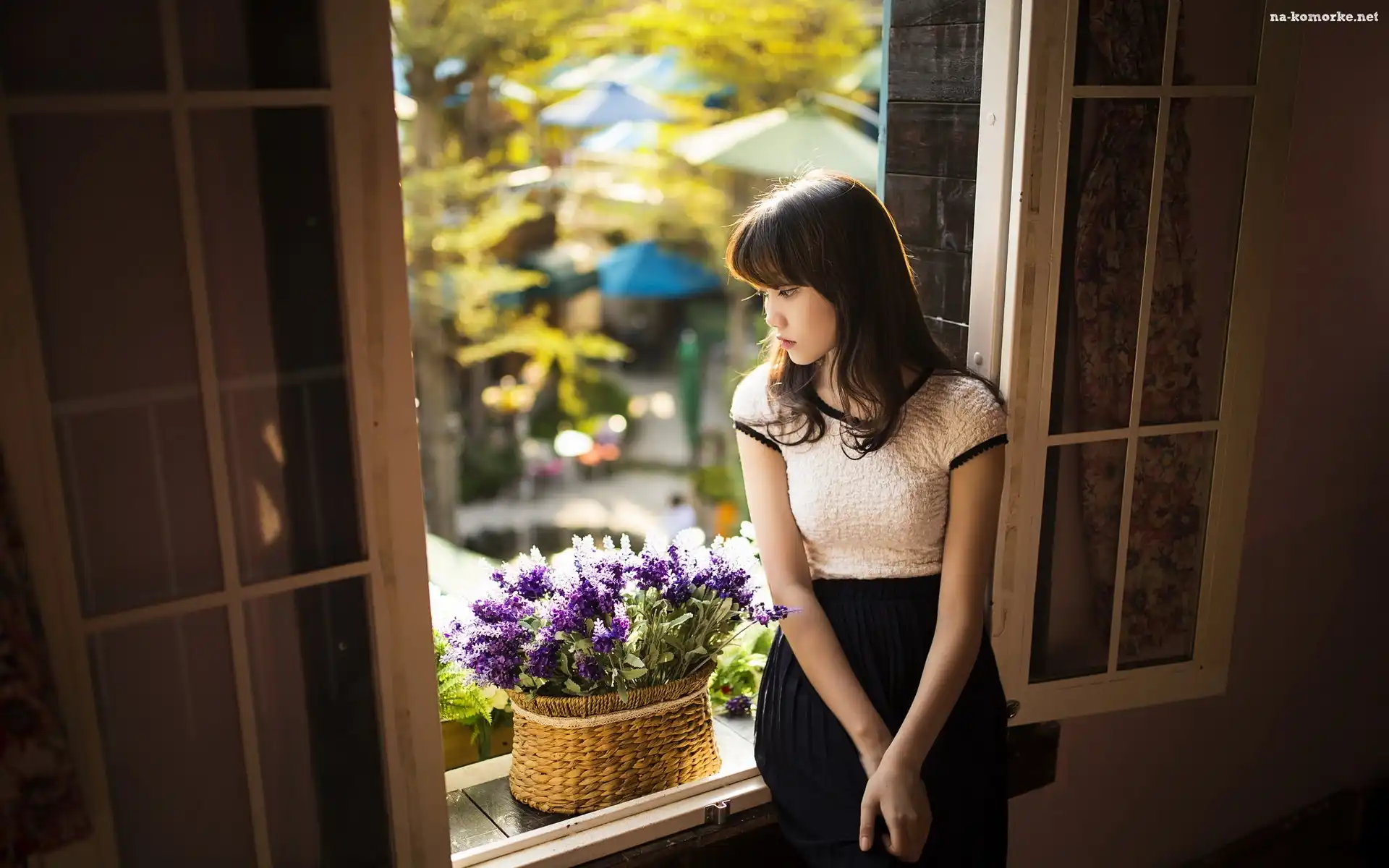 Okno, Brunetka, Dziewczyna, Koszyk, Kwiaty na Komórkę