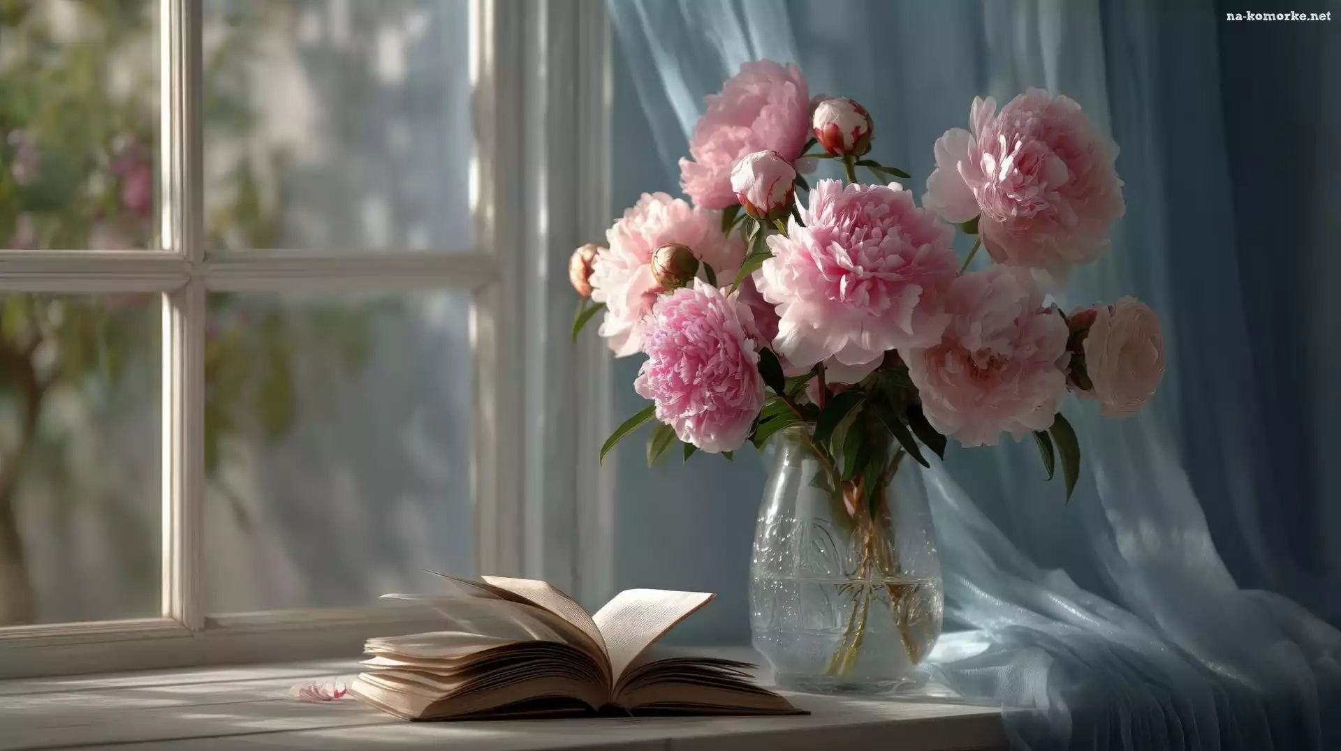 Książka, Parapet, Kwiaty, Okno, Różowe, Wazon, Piwonie na Komórkę