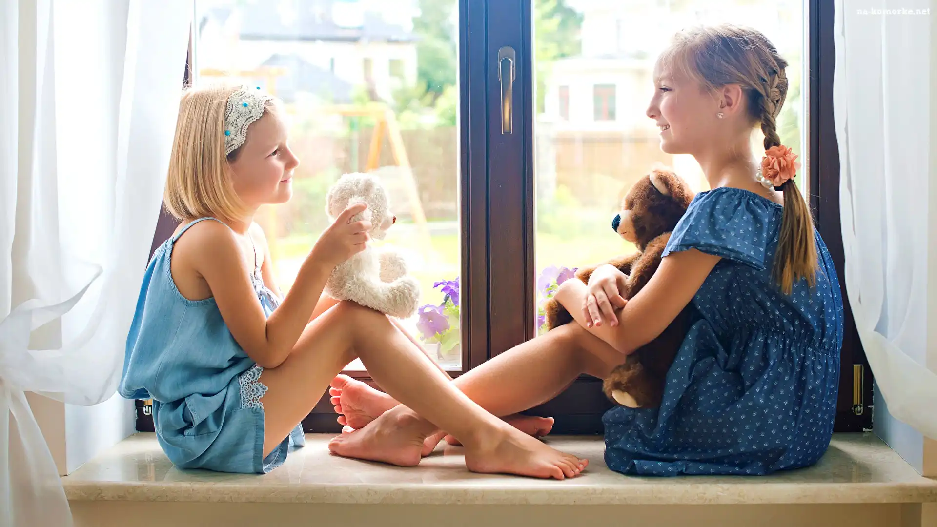 Okno, Misie, Parapet, Dziewczynki na Komórkę