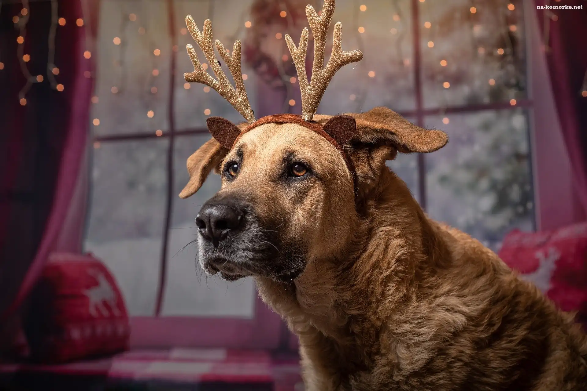Okno, Pies, Rogi, Renifer, Światełka na Komórkę