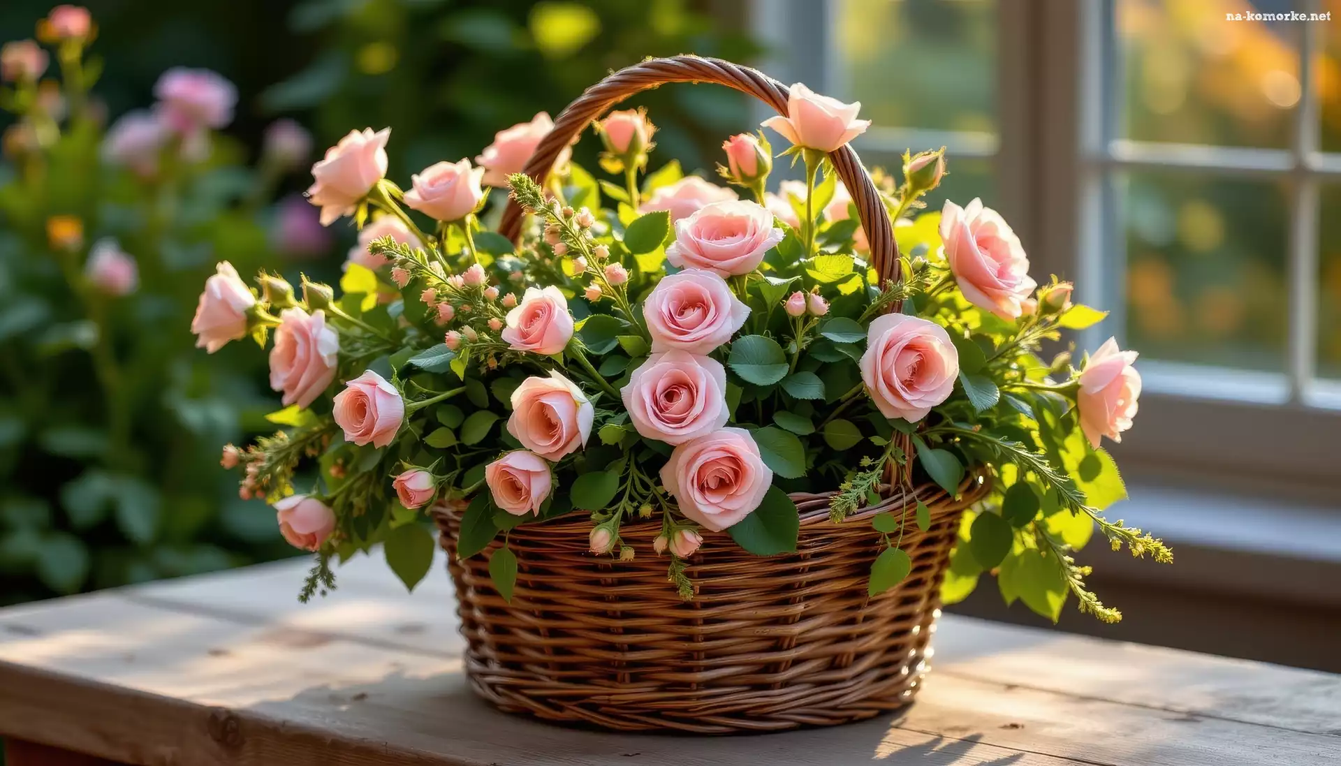 Stół, Kwiaty, Koszyk, Okno, Różowe, Róże na Komórkę