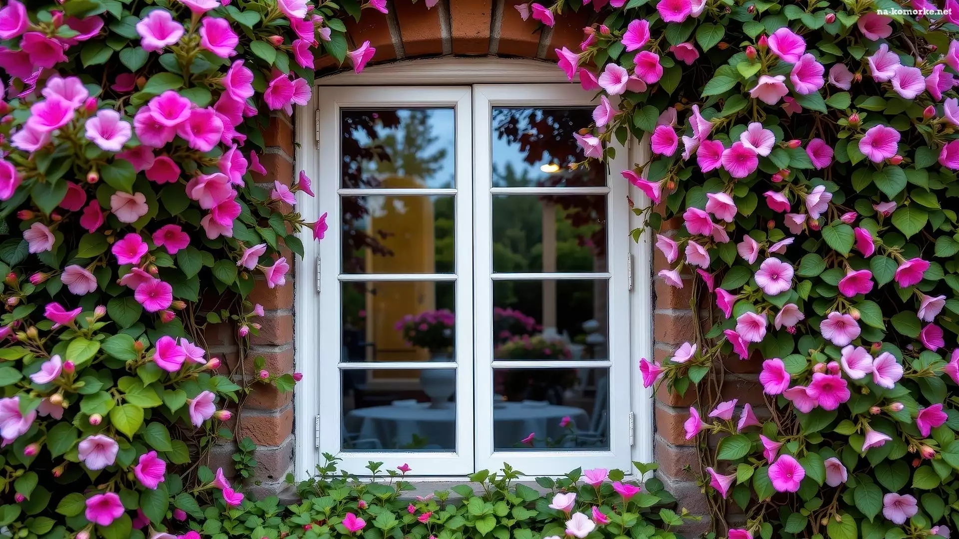 Różowe, Okno, Ściana, Kwiaty, Cegły na Komórkę