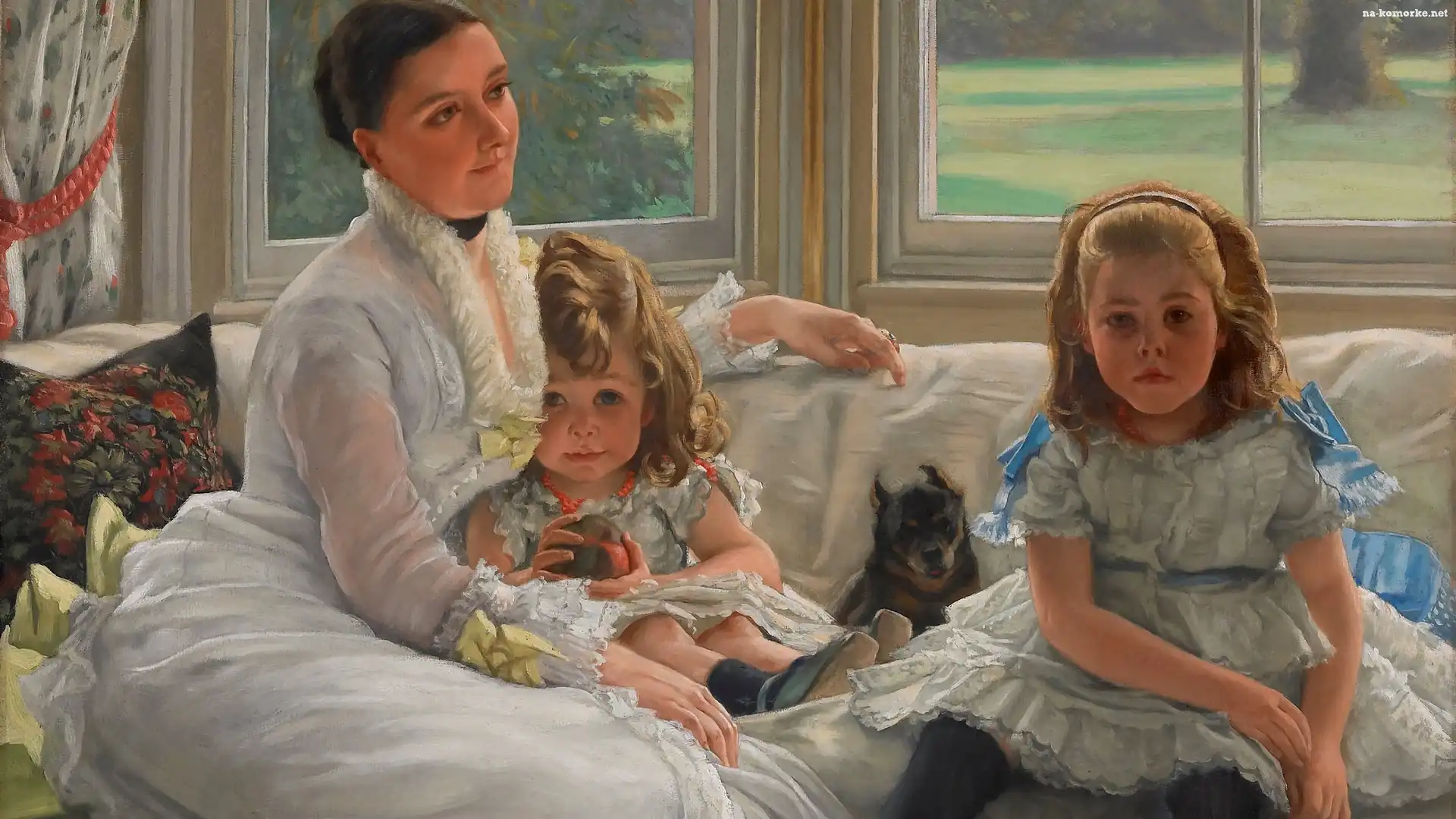 Malarstwo, Kobieta, Okno, James Tissot, Kanapa, Pies, Obraz, Dzieci, Dwie, Dziewczynki na Komórkę