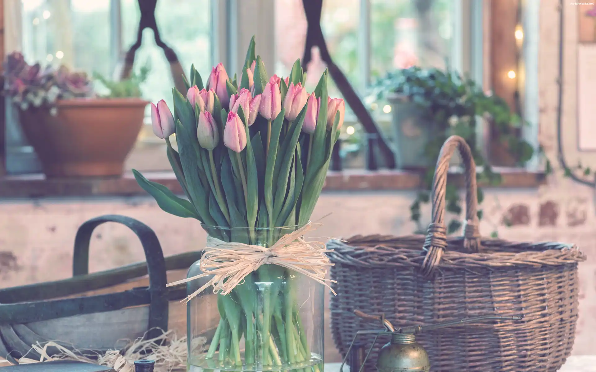 Okno, Tulipany, Bukiet, Wazon, Koszyki na Komórkę