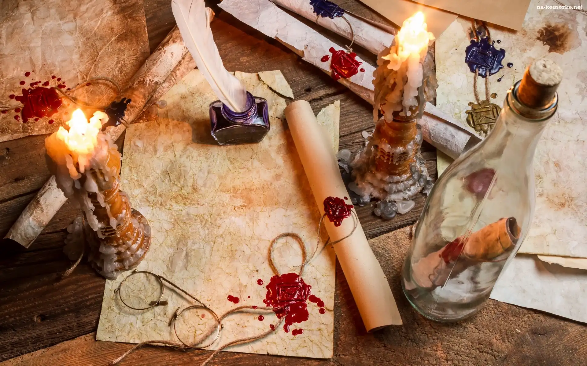 Pieczątki, Świece, Pióro, Sznurki, Kartki, Listy, Deski, Kałamarz, Okulary na Komórkę