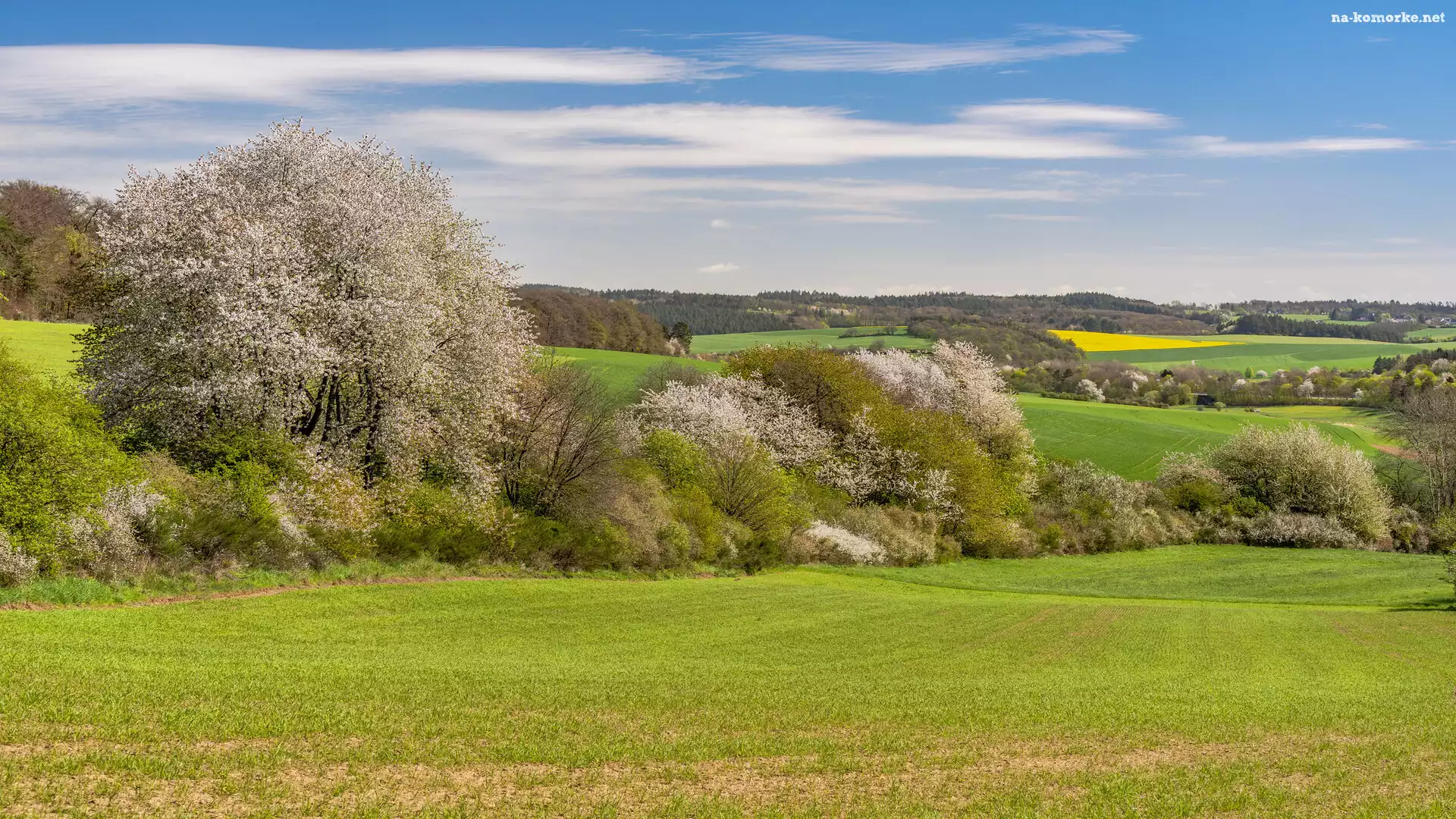 Łąka, Okwiecone, Drzewa, Pole, Wiosna na Komórkę