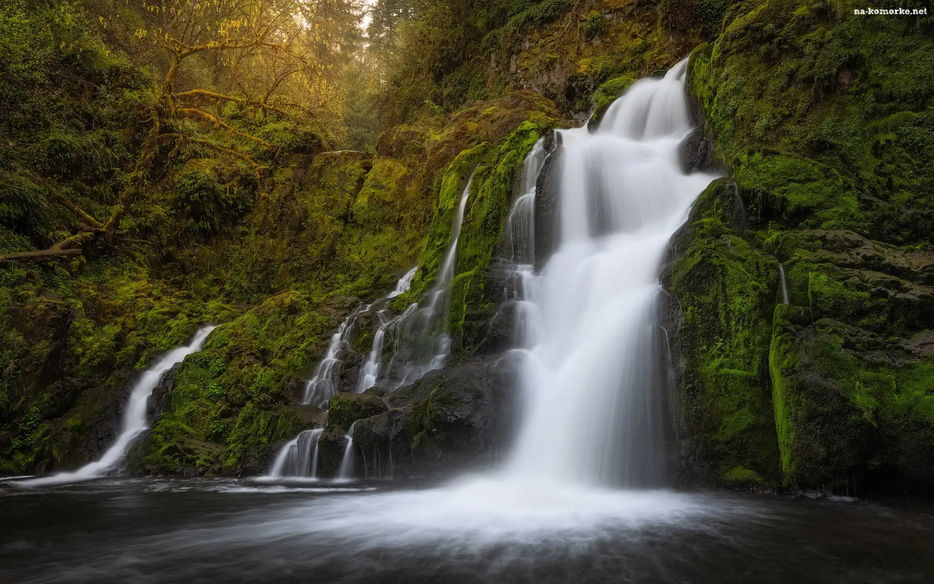 Omszałe, Las, Wodospad, Rzeka, Drzewa, Skały na Komórkę