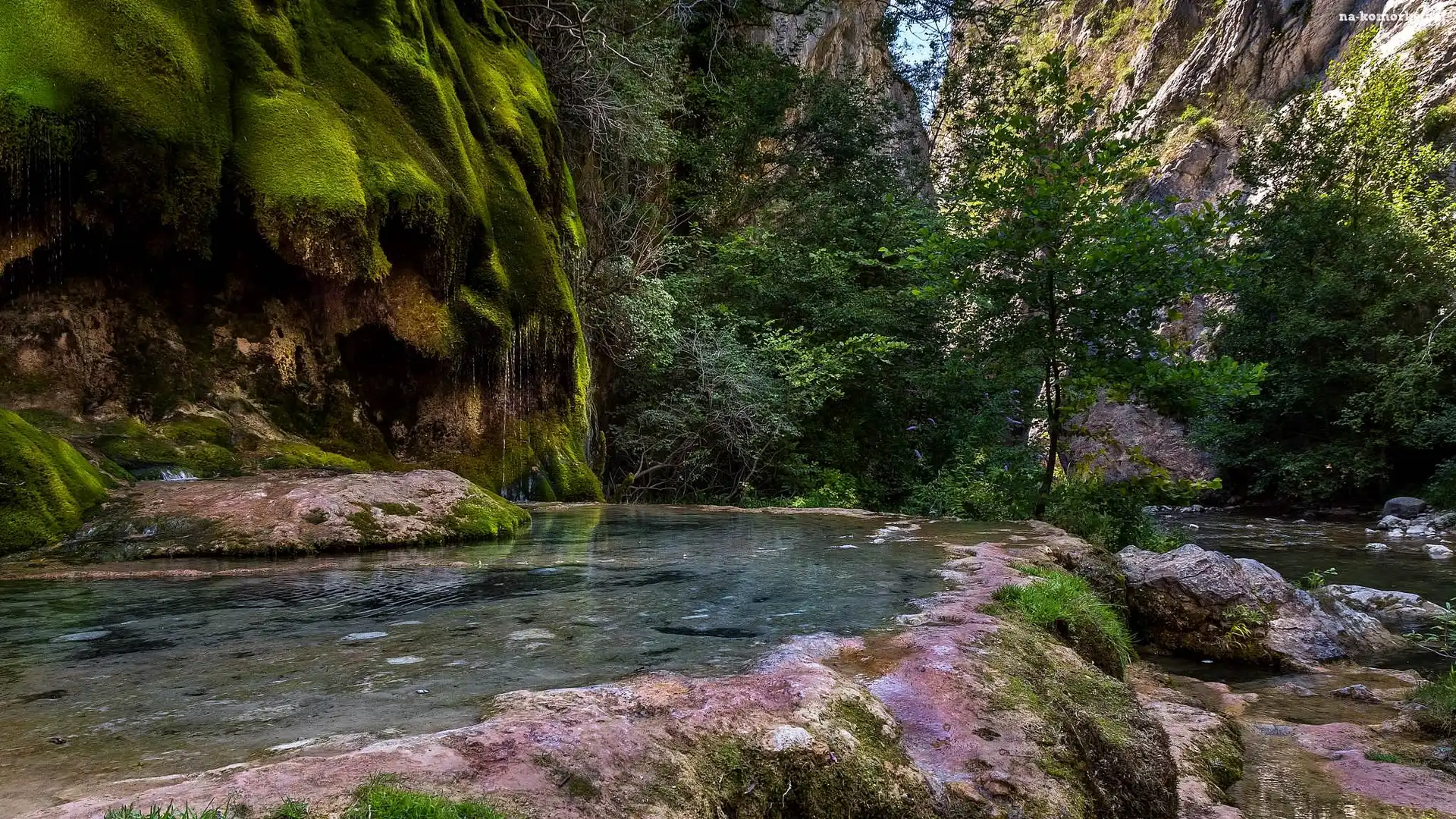 Omszone, Drzewa, Skały, Rzeka na Komórkę